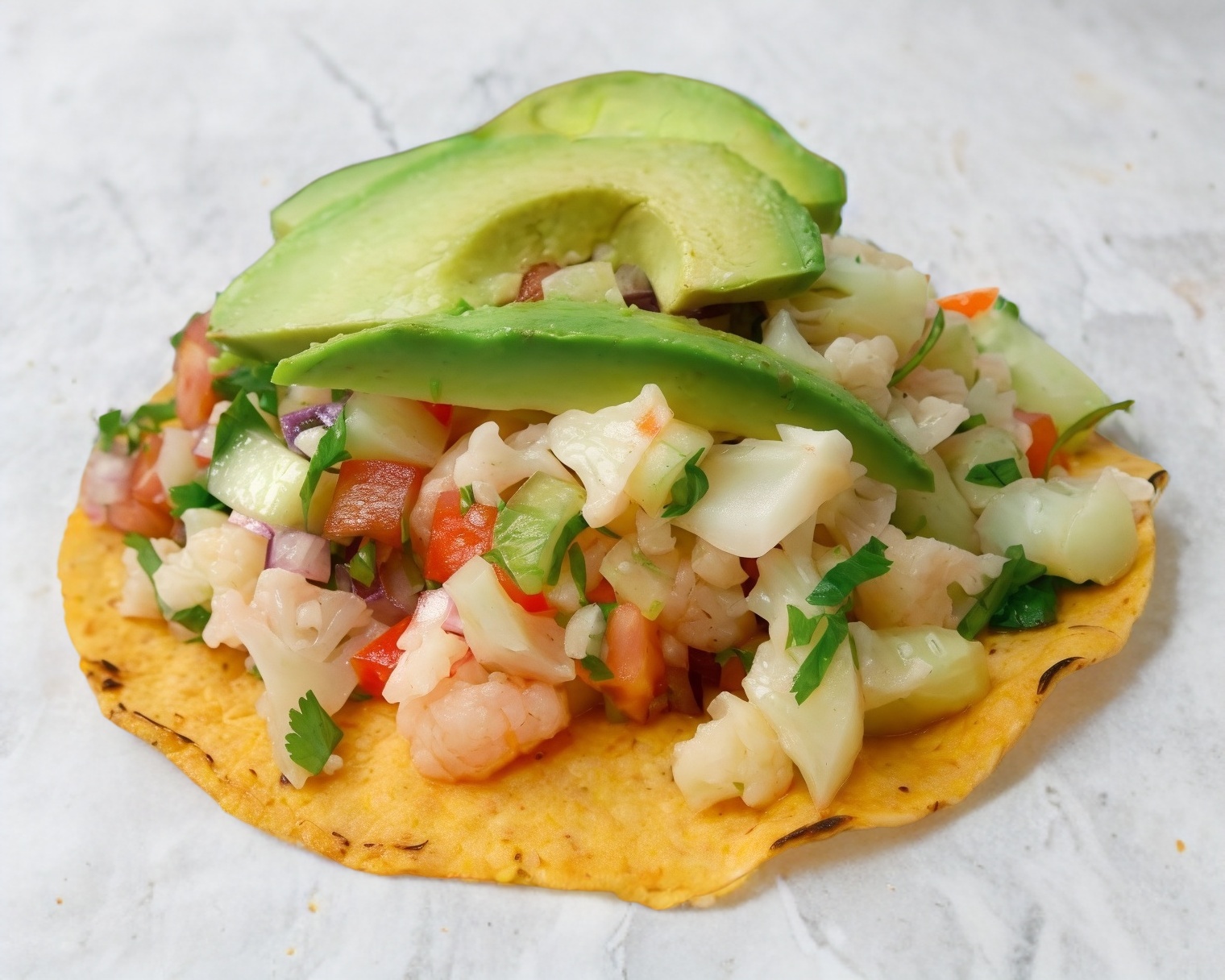 Tostada camarón, pulpo, ostión, jaiba, surimi todo picadito muy rico