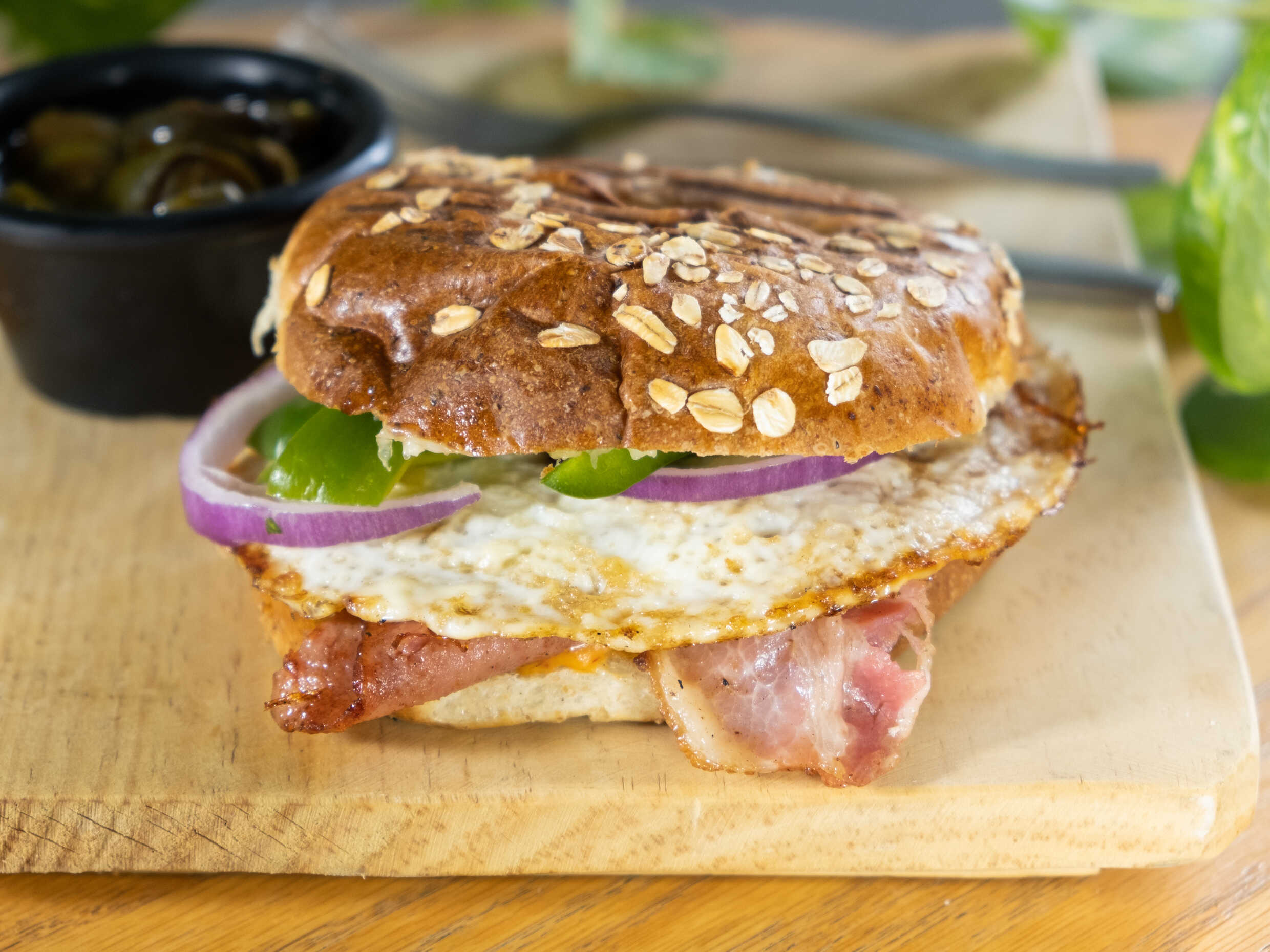 Clara de huevo, tocino, queso laurel, cebolla, pimiento y chipotle.