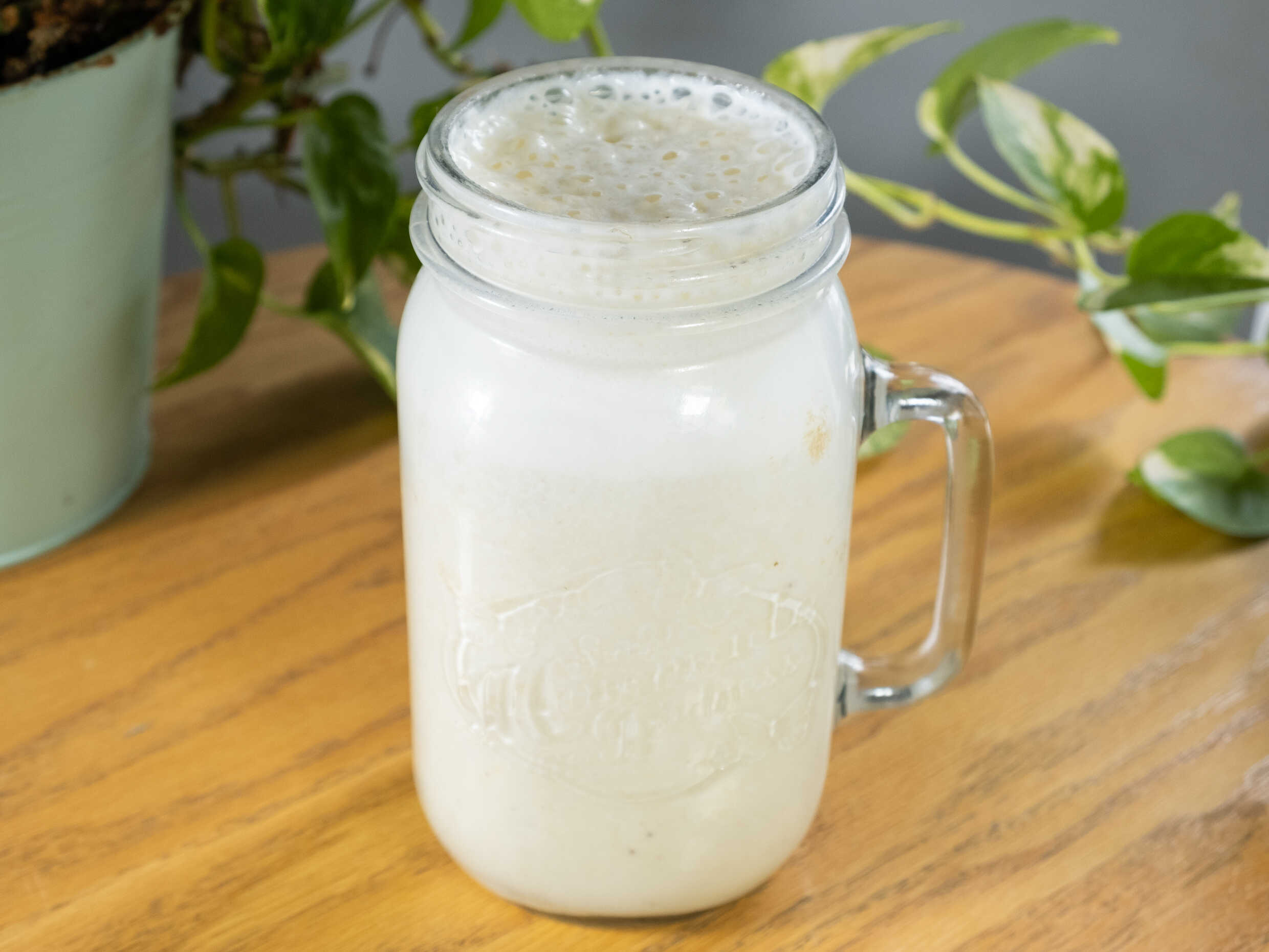 Con leche de almendras, té matcha, piña, espinaca y plátano, frappeado.