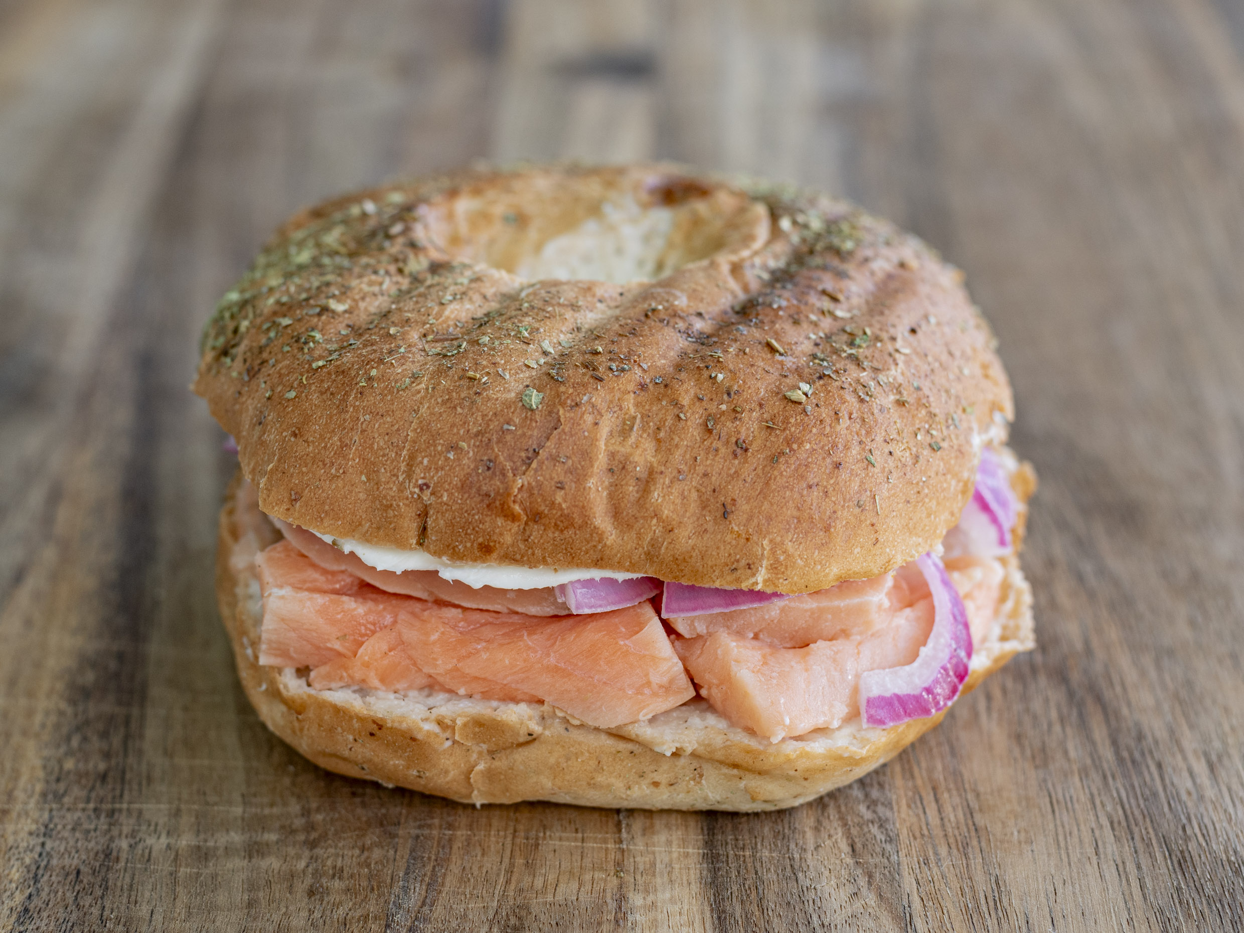 Bagel tostado con queso crema, laminas de salmón crudo con aceite de oliva y cebolla morada encurtidas.