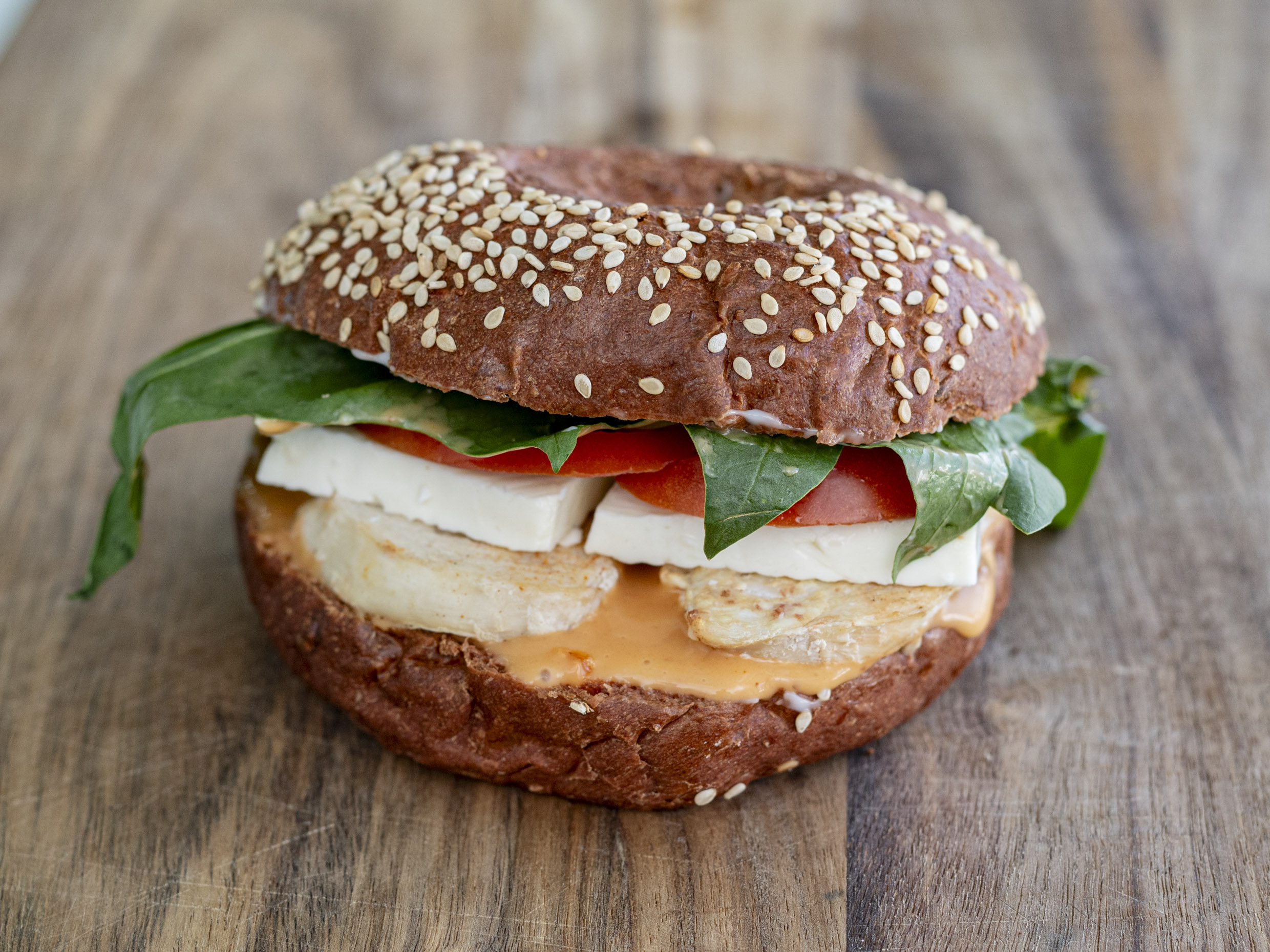 Pechuga de pollo, queso panela, tomate, cebolla morada, mayo chipotle y espinaca.
