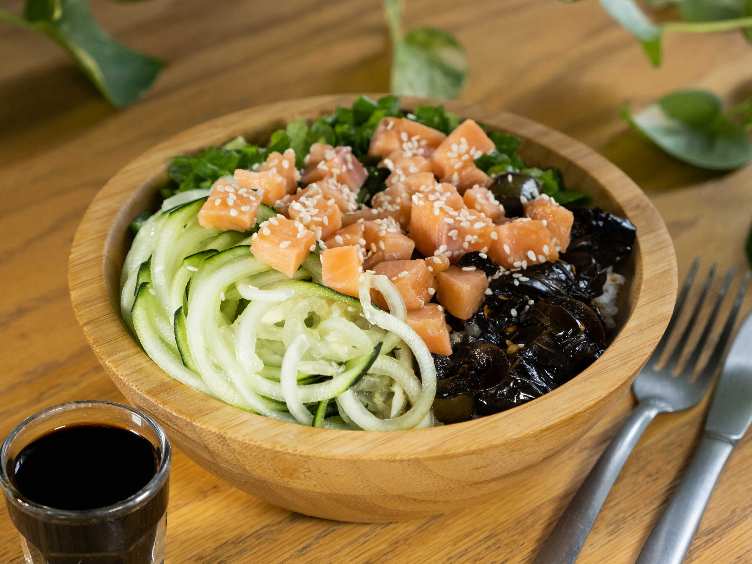 Base de quinoa, salmón bañado con mayo sriracha y servido con aguacate, edamame, brócoli, cebolla frita y soya