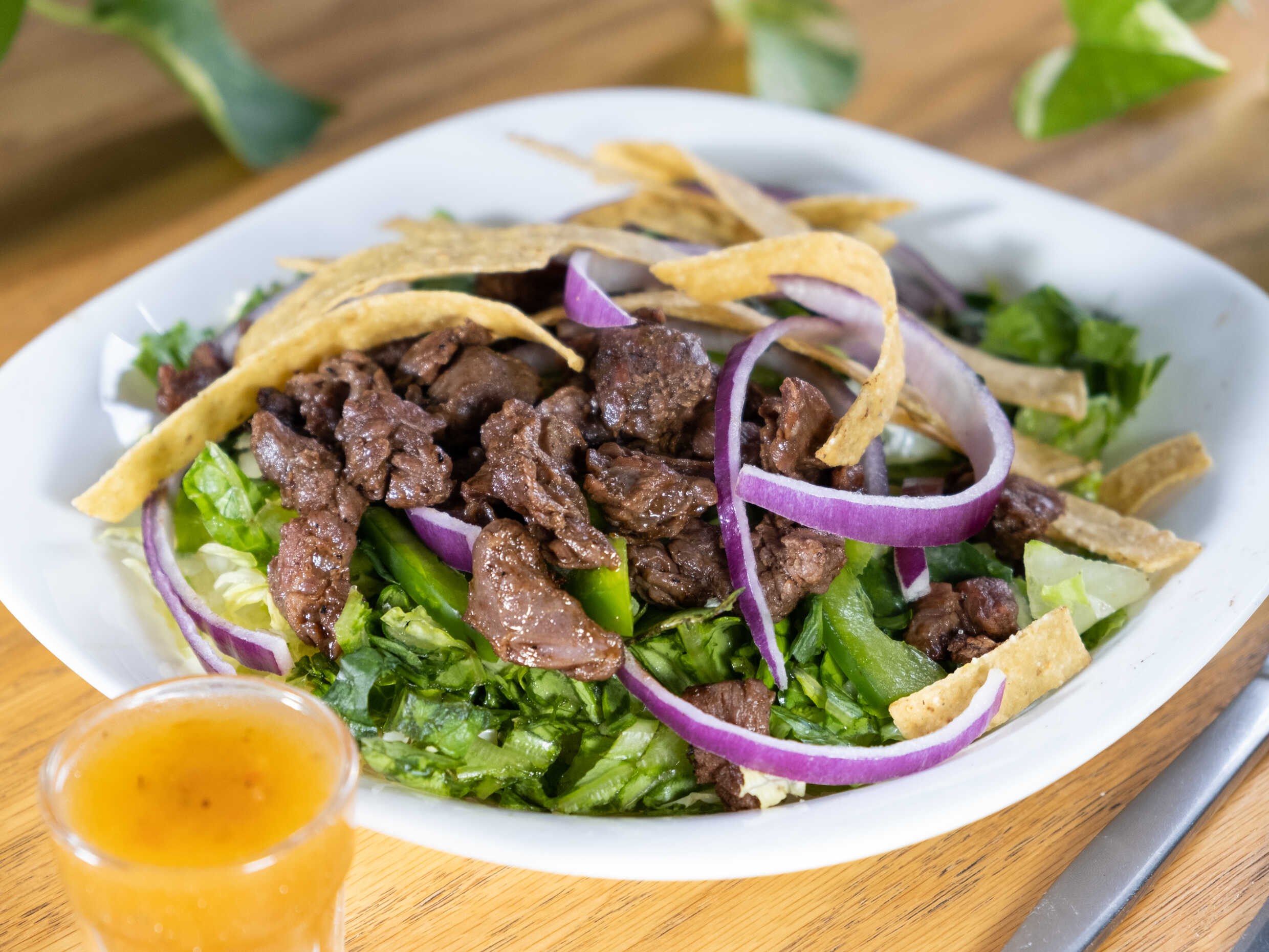 Cama de lechuga-espinaca, arrachera, pimiento verde, cebolla morada, tiras de maíz y aderezo italiano.