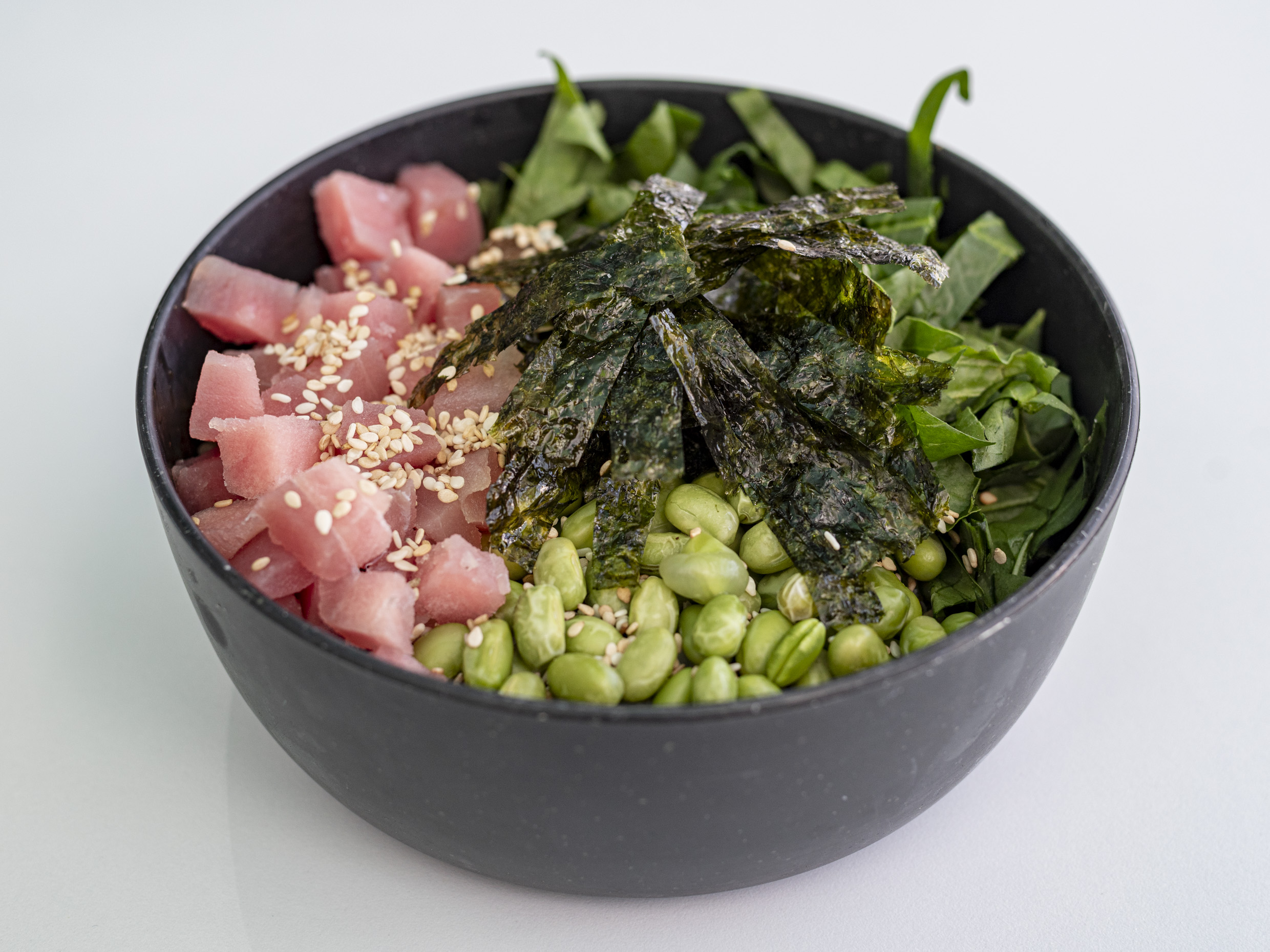 Arroz, atún marinado, edamame, cilantro, espinaca, alga nori, ajonjolí y soya