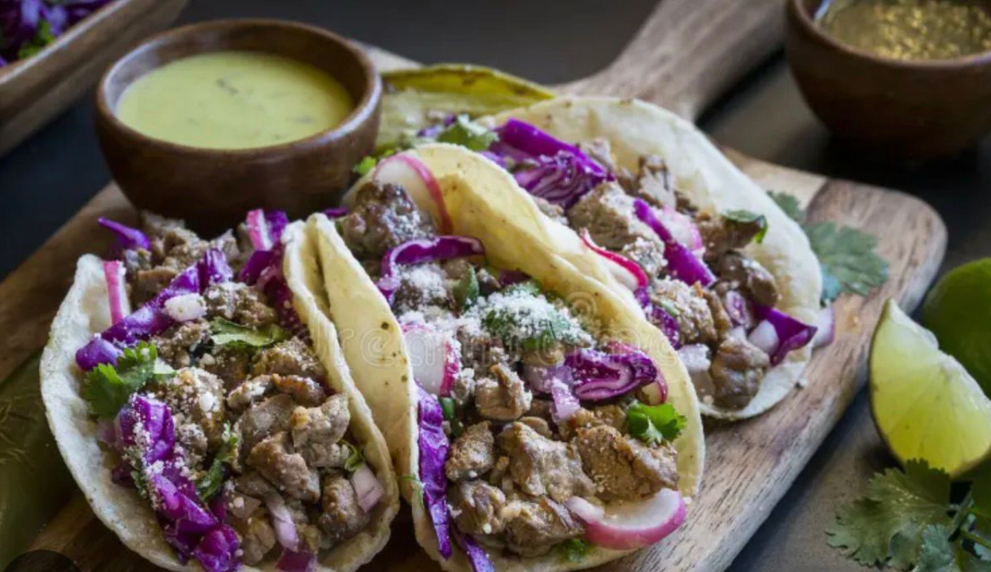 4 Deliciosos tacos de bistec, acompañados con pepino, cebolla, col morada y cebollitas guisadas en nuestras salsas negras. Incluye limón y salsas de la casa.