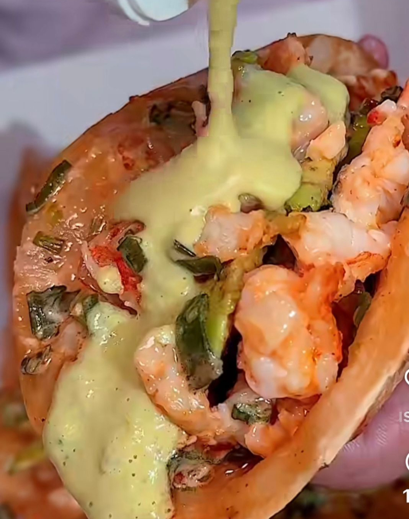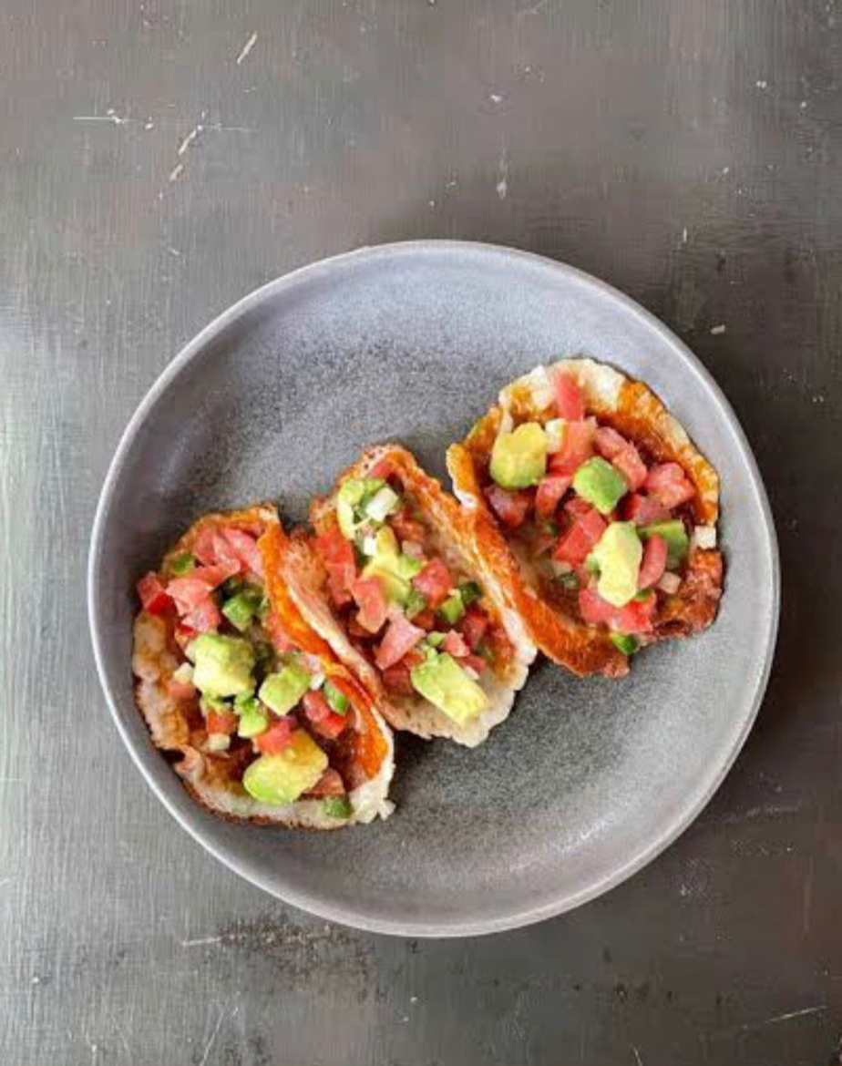 3 Piezas de costra de queso crujiente rellenas de camarones marinados, aguacate, cebollas encurtidas y cilantro fresco