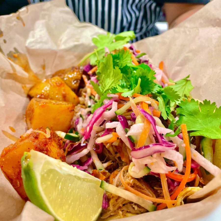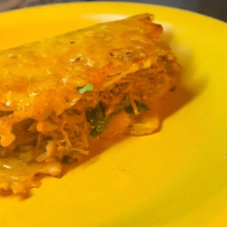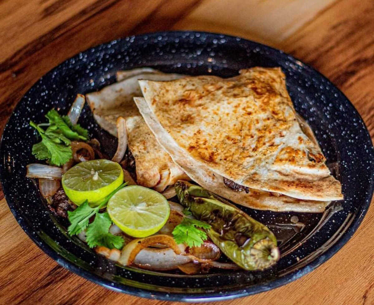Taco individual de bistec, con una costra de queso Chihuahua, en tortilla de harina. Acompañado de cilantro, cebolla morada encurtida y aderesos de la casa.