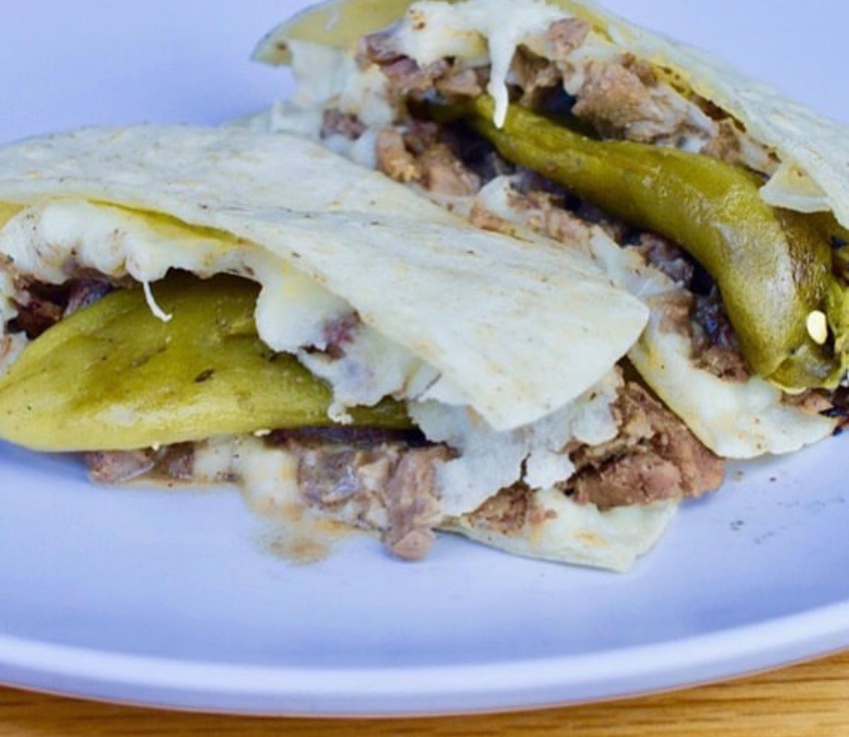 Chilaca asada servida en tortilla de harina grande con queso manchego fundido. Servido con camarón o con jugoso bistec.