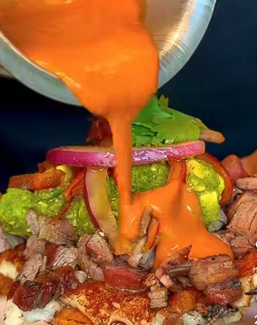 El balance ideal de queso menonita fundido con bistec, pepino, col morada y cebollitas guisadas. Un favorito de la casa.