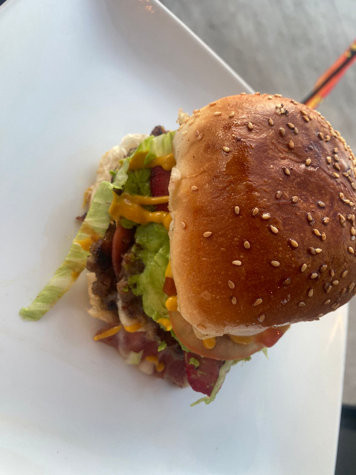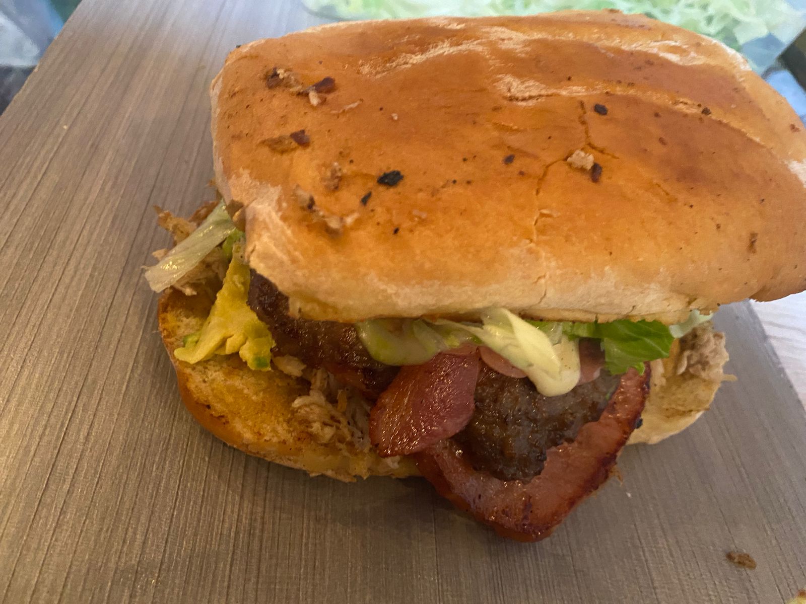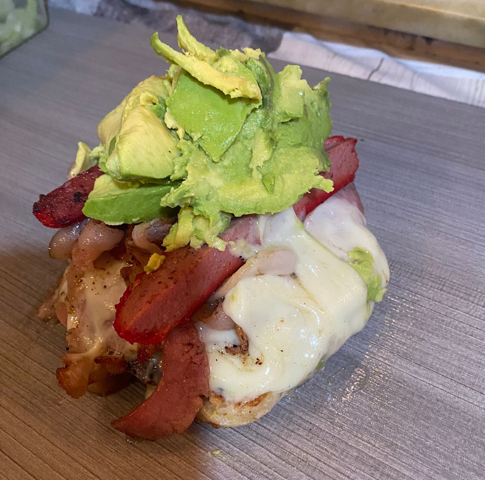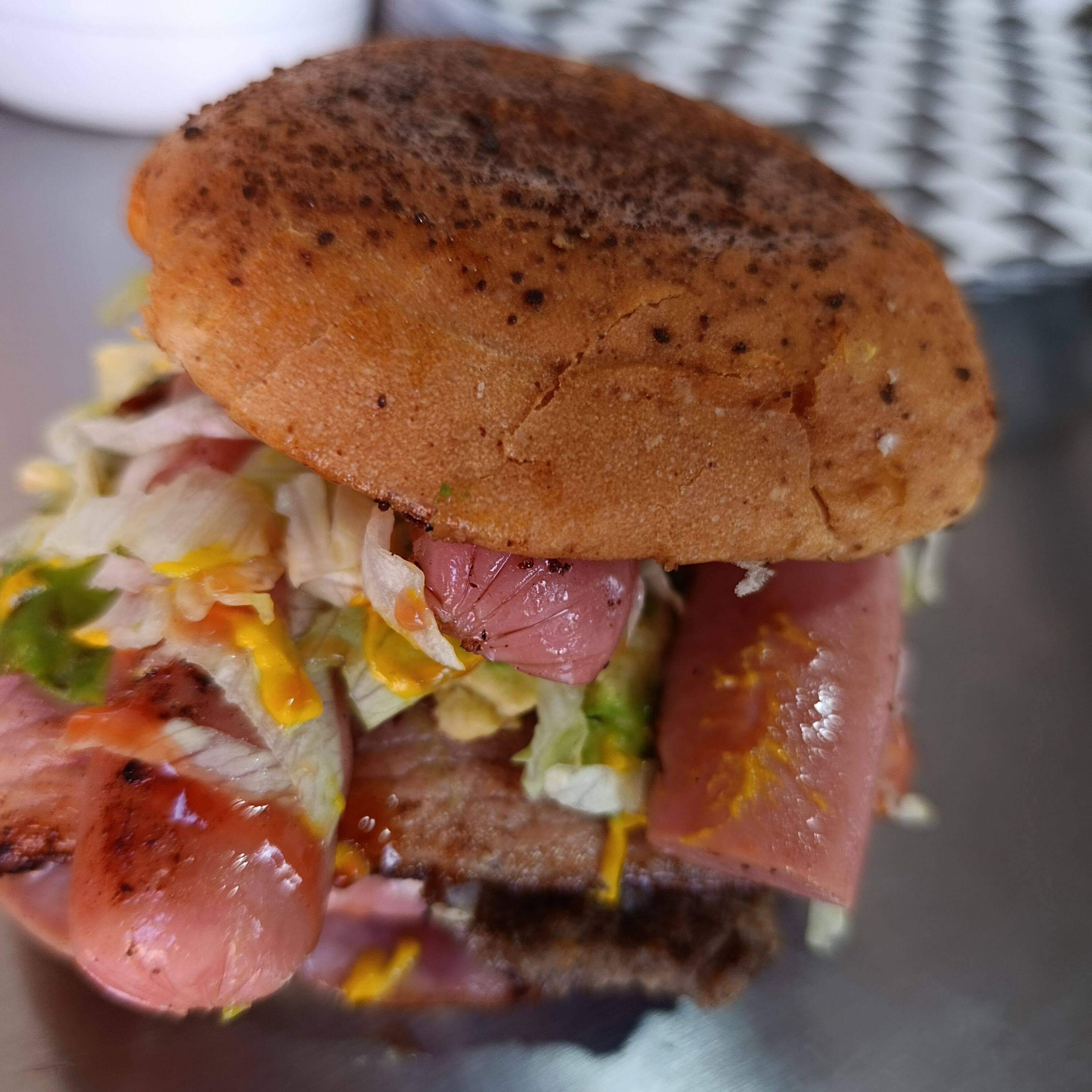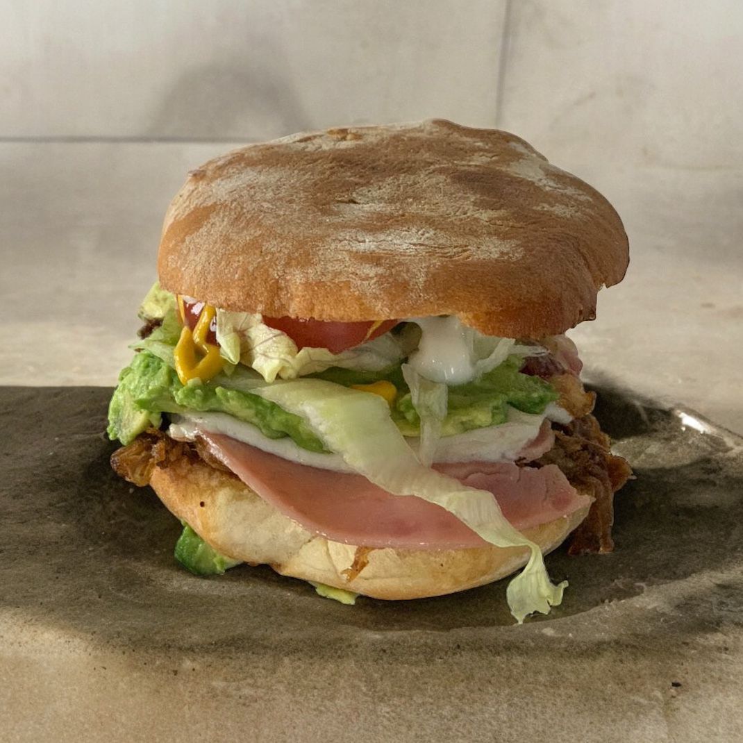 Doble carne, jamón, 2 quesos, aguacate, tocino, verdura, aderezos.