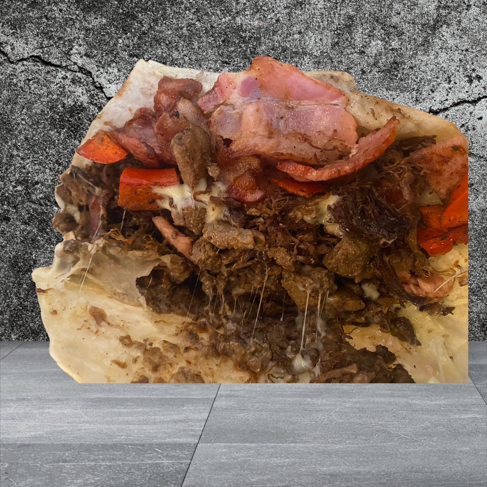 Carne, piña, jamón, queso, aguacate, tocino, verdura y aderezo.