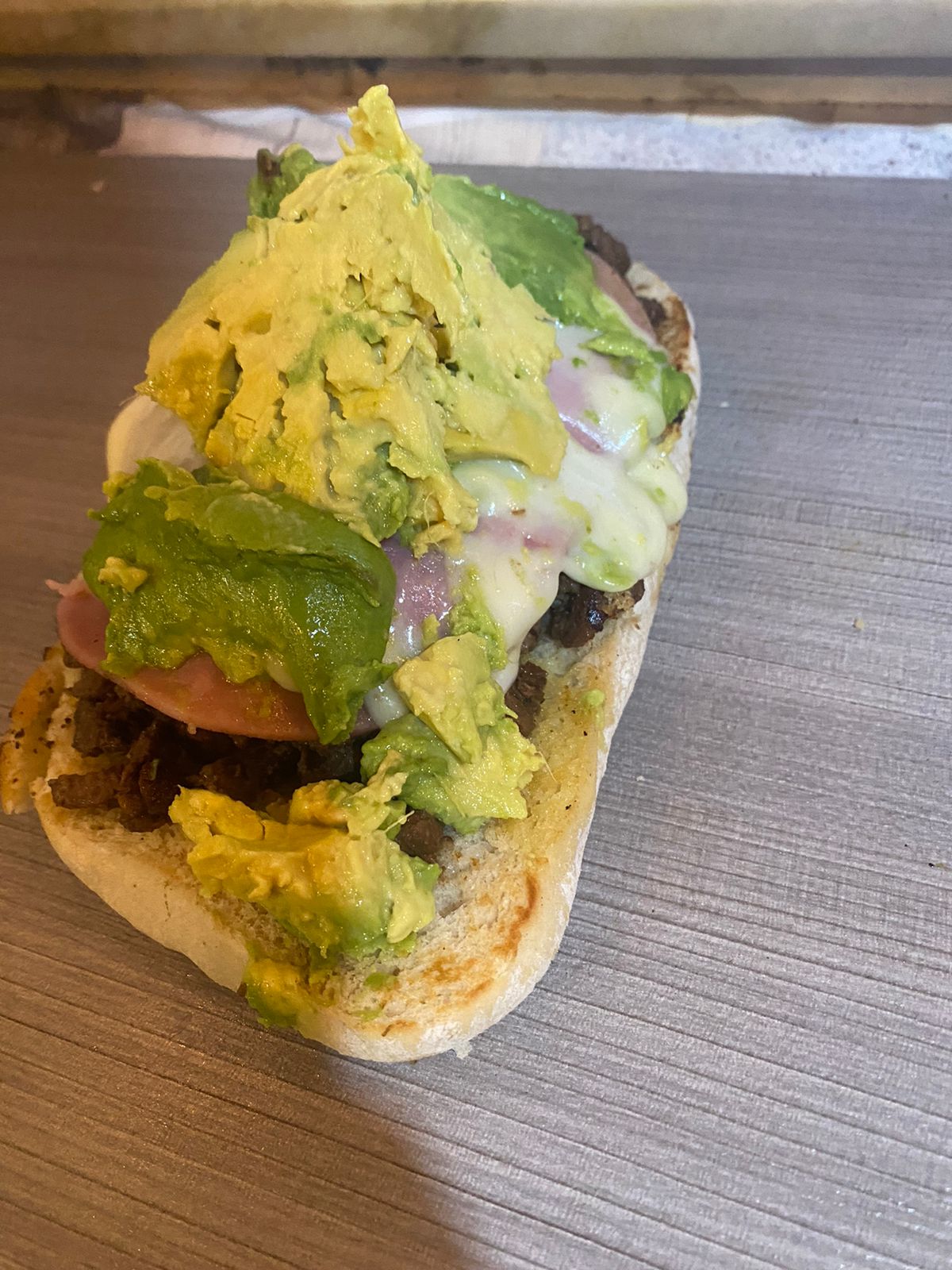 Bistec, jamón, queso, aguacate, verdura y aderezo.