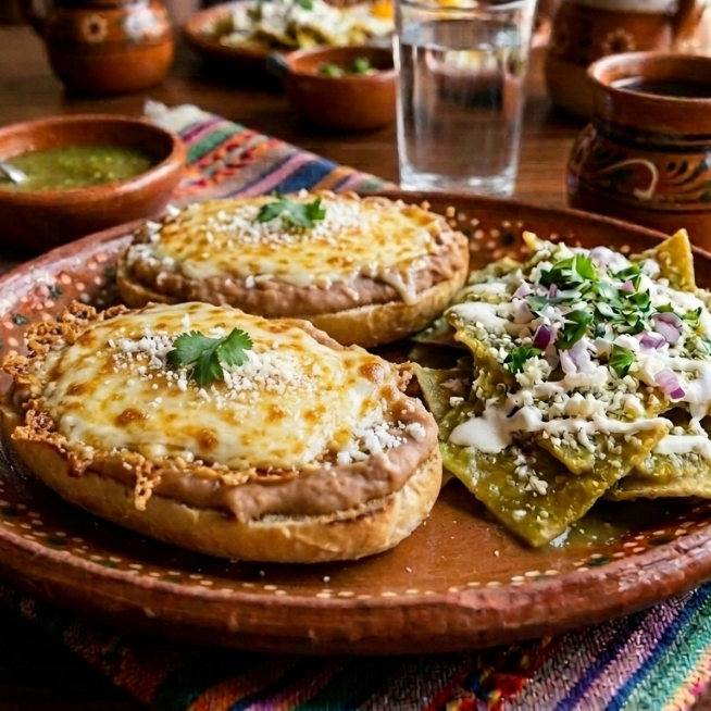 2 molletes con frijoles refritos , queso e incluye chilaquiles