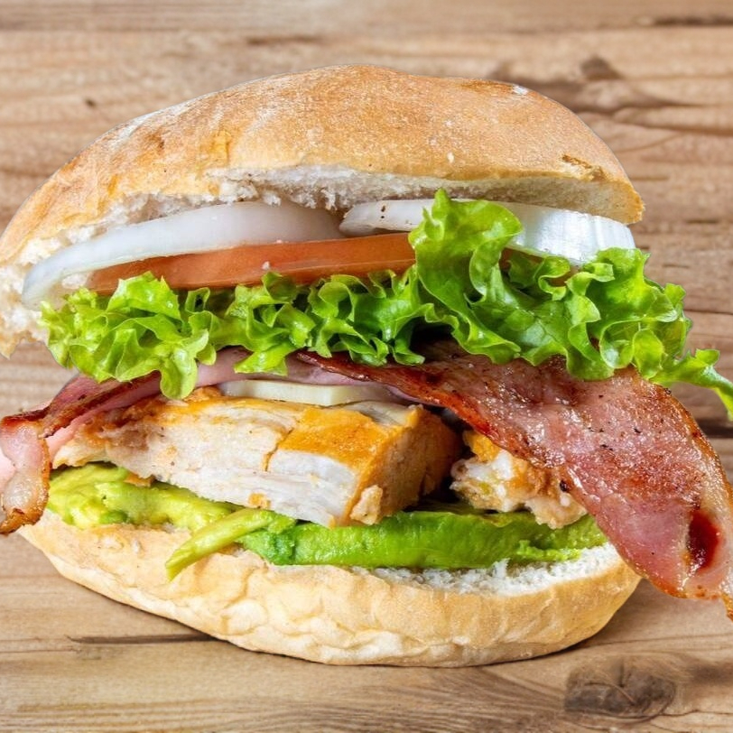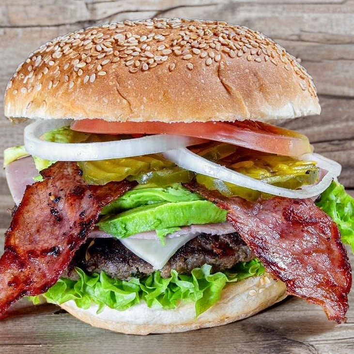 pan, carne 150gr, queso menonita, jamon, tocino aguacate, catsup, aderezo, mostazo, lechuga, tomate, cebolla, pepinillos