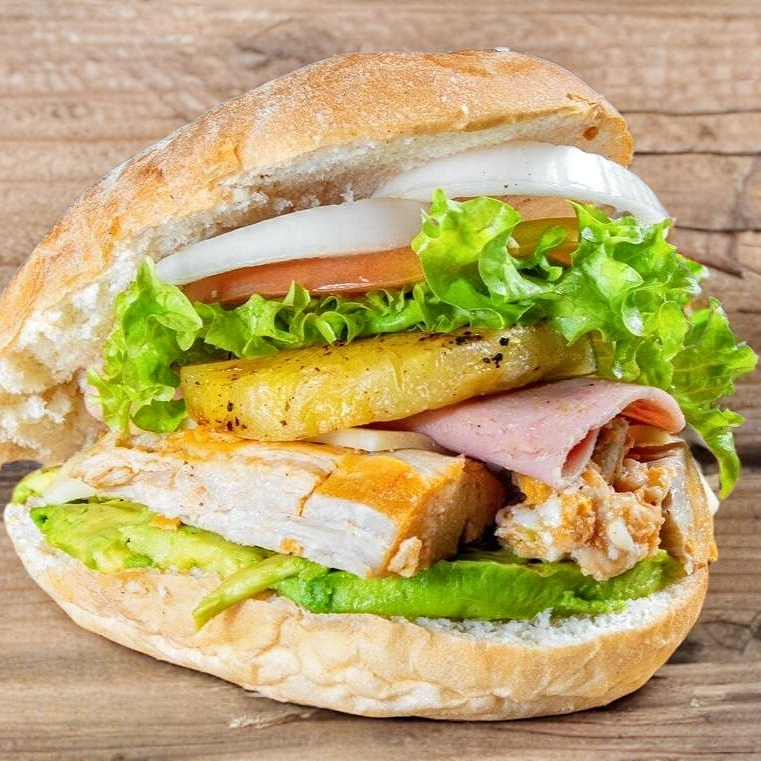 pan, lomo de puerco, queso menonita, jamon, aguacate, lechuga, tomate aderezo, mostaza