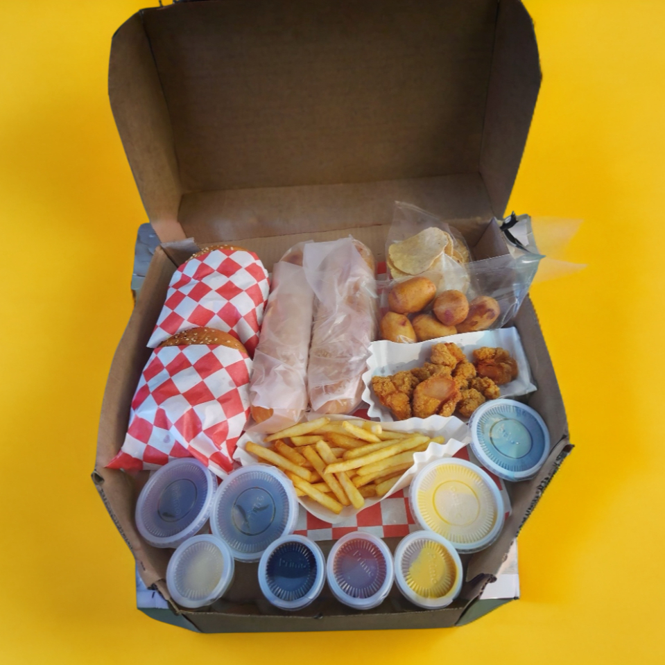 2 HAMBURGUESAS CON JAMÓN 2 TORTAS DE PASTOR AROS DE CEBOLLA MINIBANDERILLAS PAPAS FRANCESAS NACHOS ORDEN DE BONELES BBQ