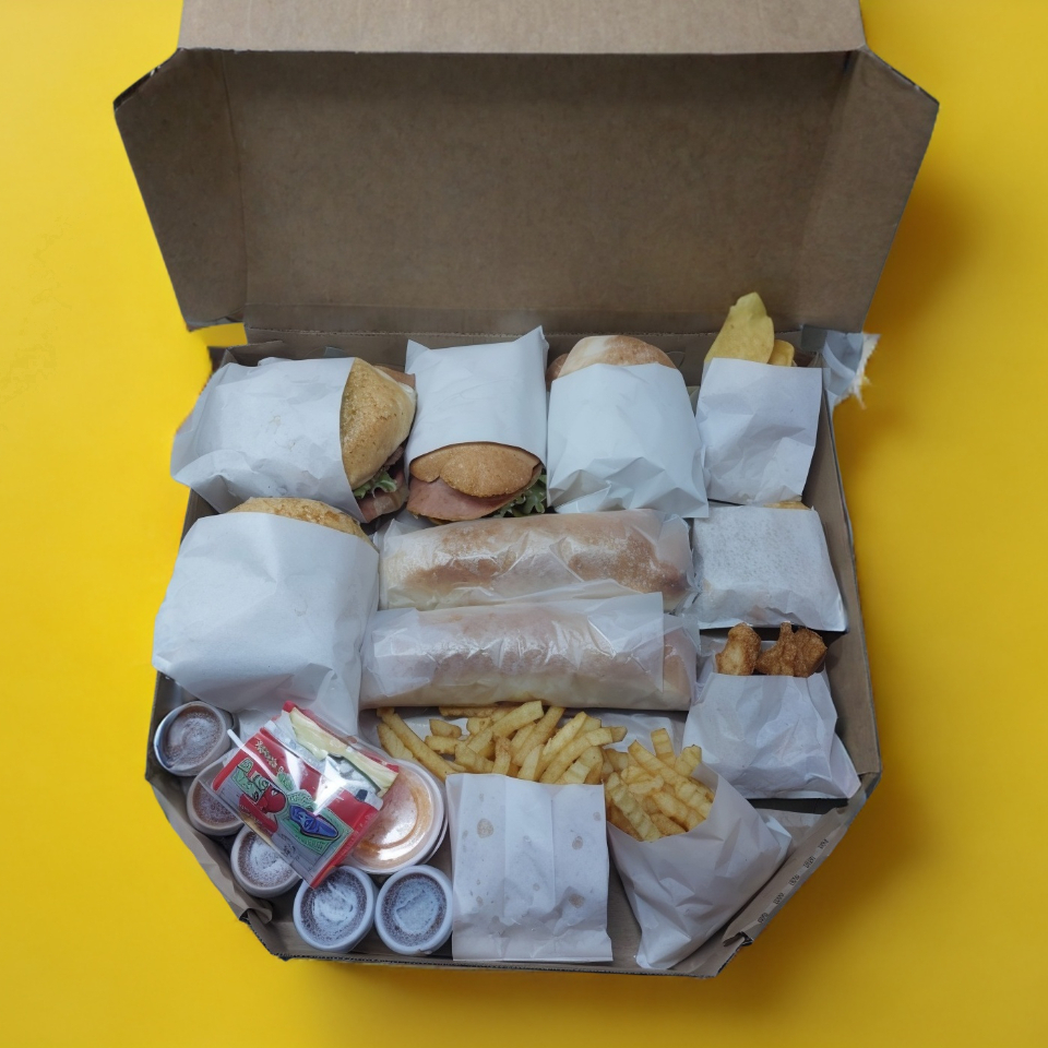 2 hamburguesas DOBLES con jamón Y GUACAMOLE 2 hot dogs 2 tortas de lomo (jamón y aguacate) Aros de cebolla papas francesas nachos 6 minibanderillas