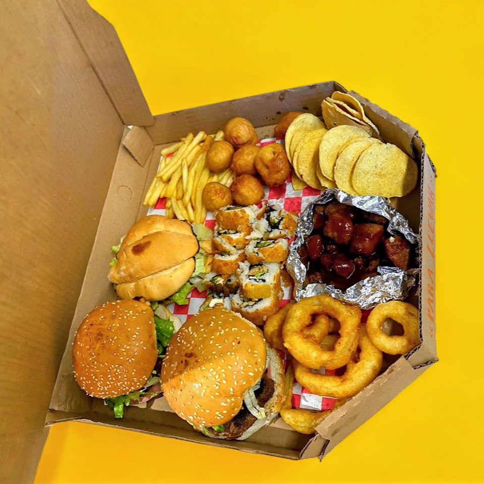 2 HAMBURGUESAS CON JAMÓN 1 TORTA DE LOMO 1 ROLLO DE SUSHI PAPAS FRANCESAS AROS DE CEBOLLA MINIBANDERILLAS NACHOS