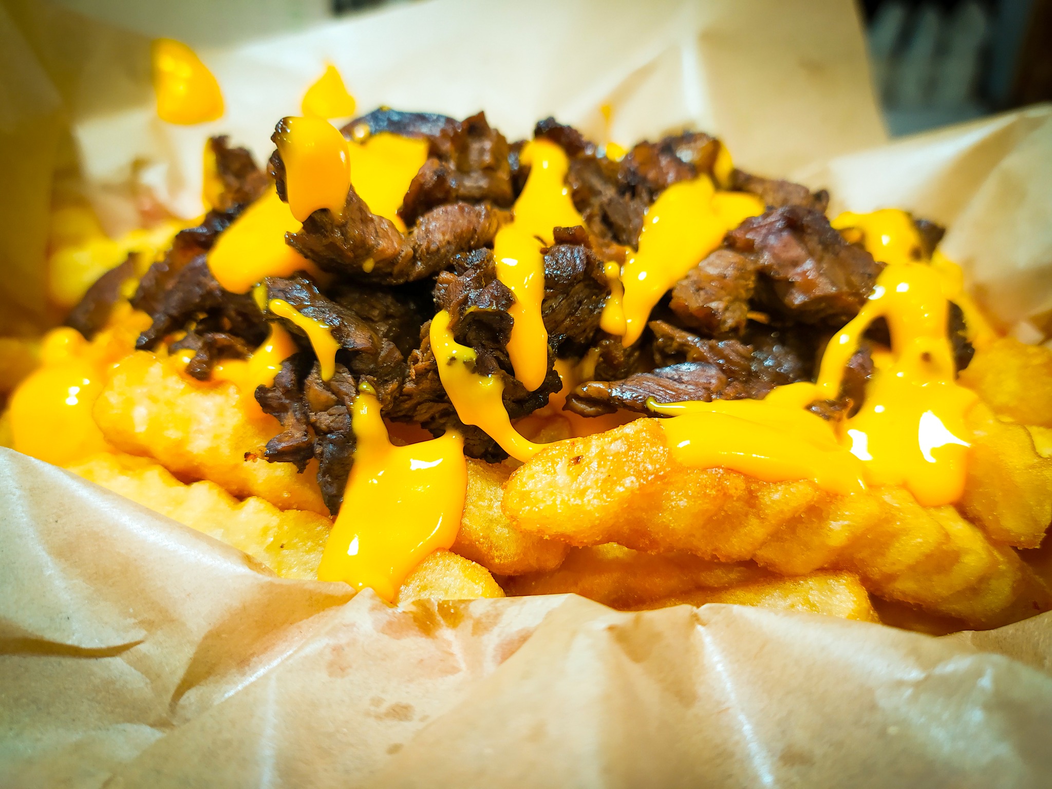 Porción grande de papas a la francesa con 250 g de arrachera y bañados en queso amarillo.