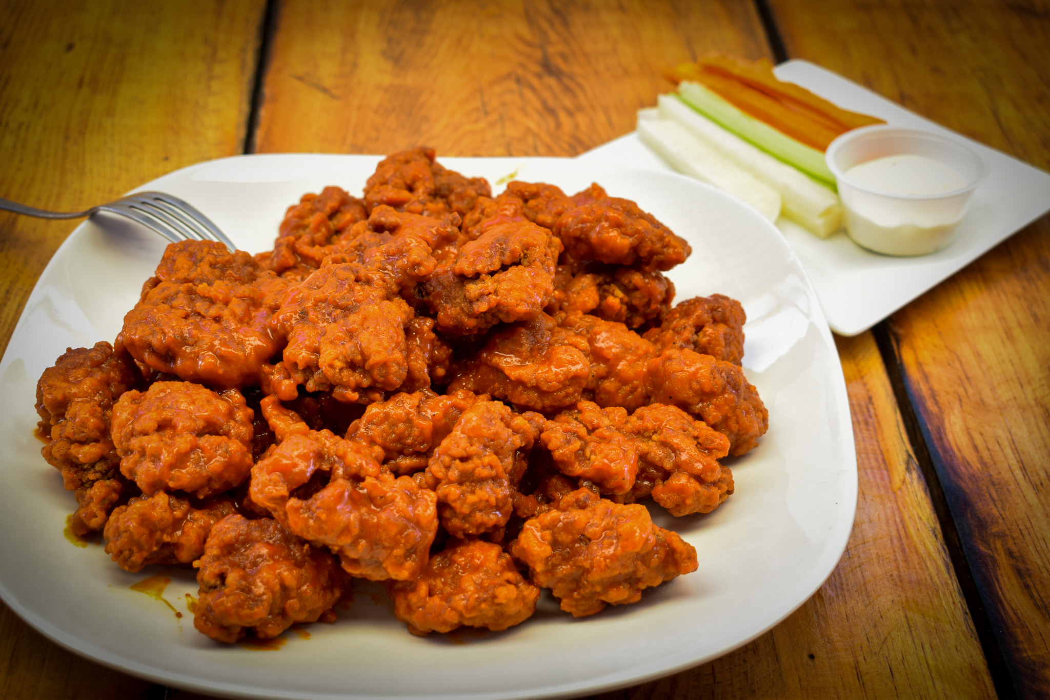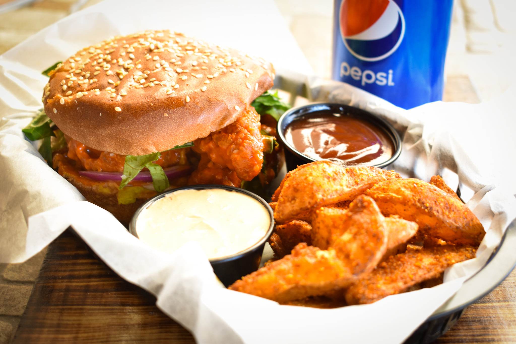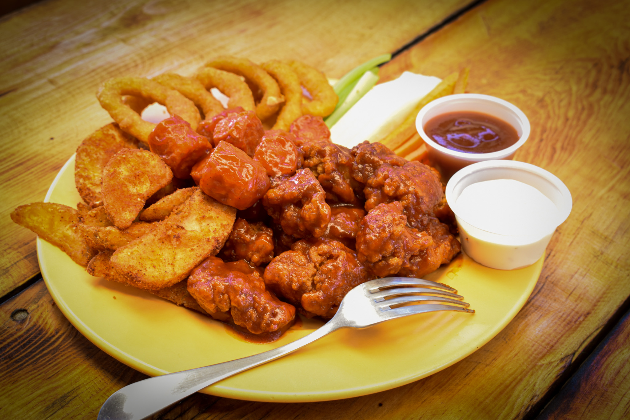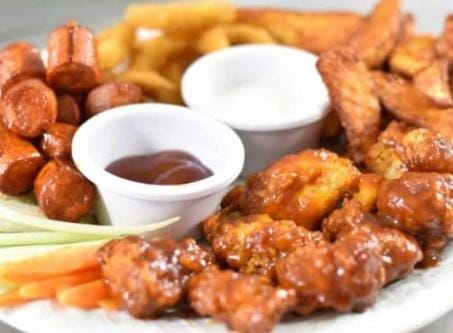 Con 250 g de boneless, papas gajo, aros de cebolla y winnies a la BBQ.