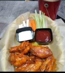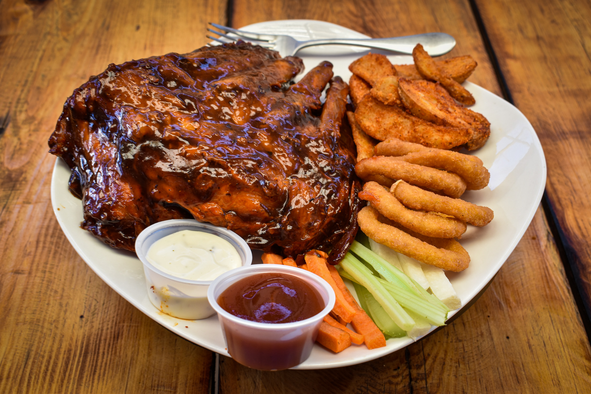 Medio kg de costillas de puerco, bañadas en salsa o naturales, acompañadas de papas gajo, aros de cebolla, verdura, jícama, apio y zanahoria.
