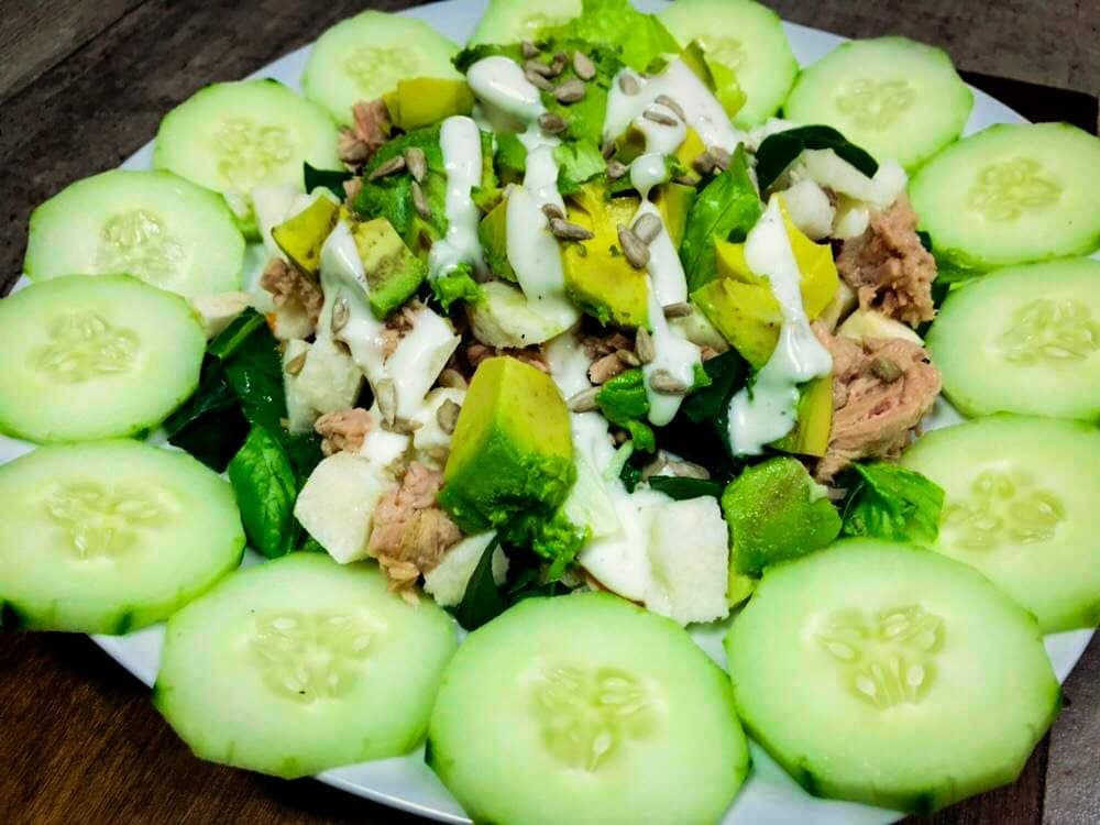 Lechuga, espinaca, acelga, zanahoria, pepino, jícama, apio, arándano, pepita, ajonjolí y atún.