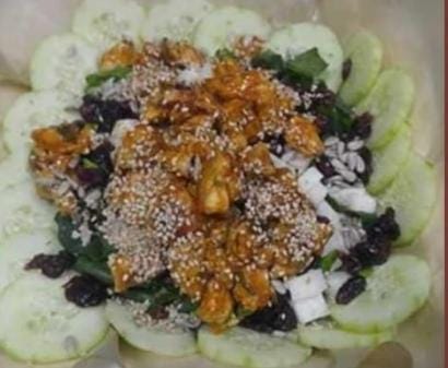 Lechuga, espinaca, acelga, zanahoria, pepino, jícama, apio, arándano, pepita, ajonjolí y pollo a la plancha.