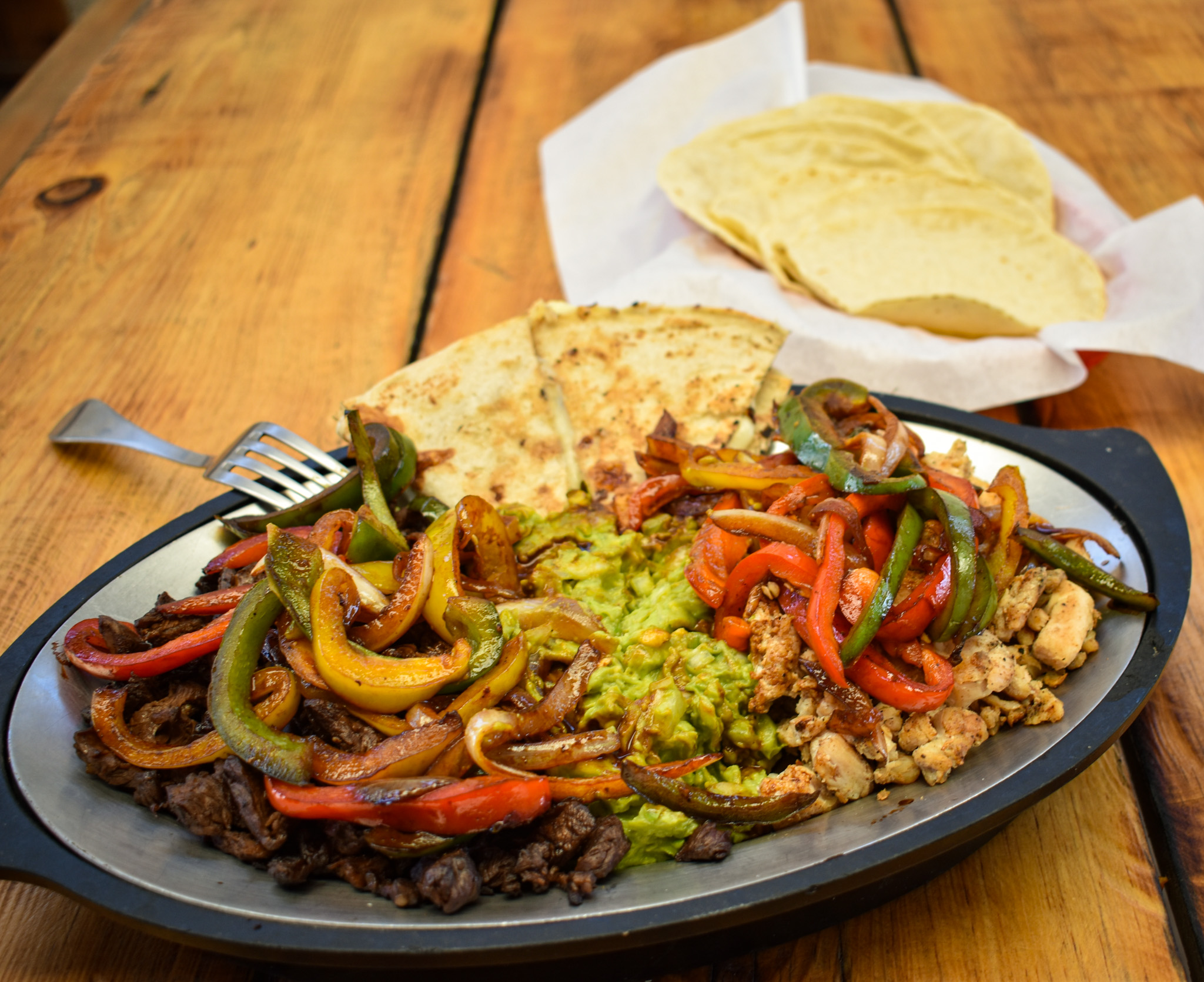 Con 400 g de carne de res marinada, 400 g de pollo mezclados con cebolla, chile morrón, chile jalapeño, acompañado de guacamole de la casa, una quesadilla de harina partida y 10 tortillas de maíz.
