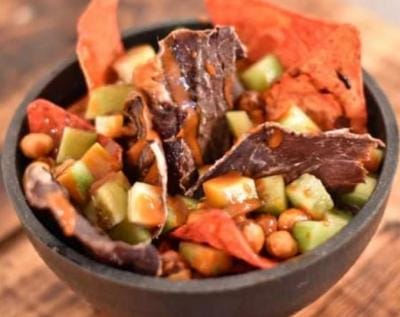 Con aderezo, queso, 200 g de arrachera, aguacate, tocino, verdura, cebolla morada y papas gajo.