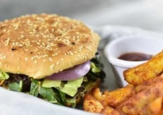 Pan de hamburguesa, aderezo, verdura, cebolla, aguacate y se acompaña de papas a elección.