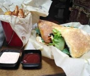 Con aderezo, queso, 250 g de pollo empanizado, verdura y papas gajo.