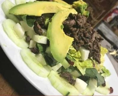 Lechuga, espinaca, acelga, zanahoria, jícama, apio, aguacate, cebolla morada, pepita y arrachera.
