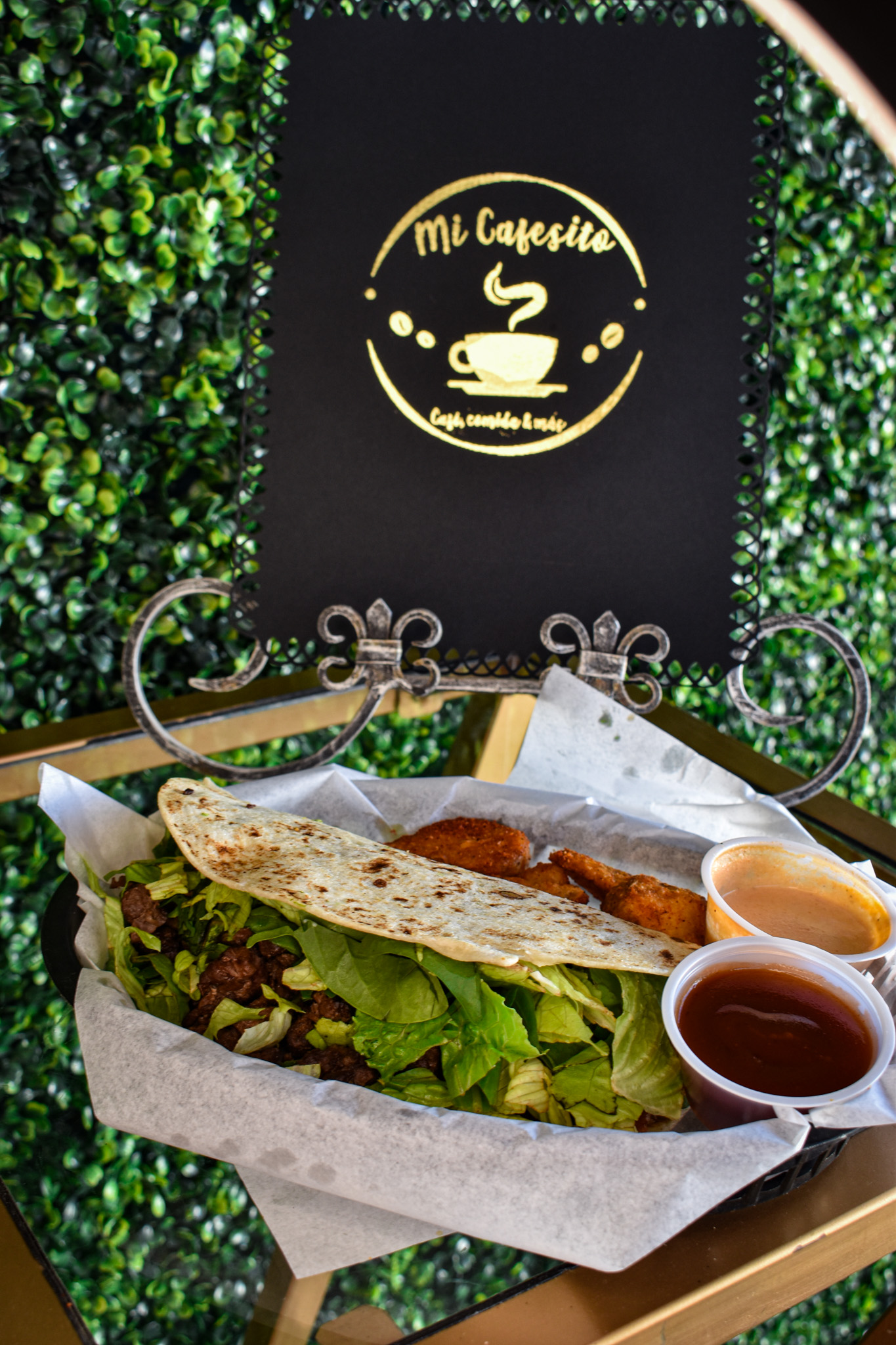 Tortilla de harina, aderezo, queso, tocino, 200 g de arrachera, aguacate, verdura y cebolla morada.