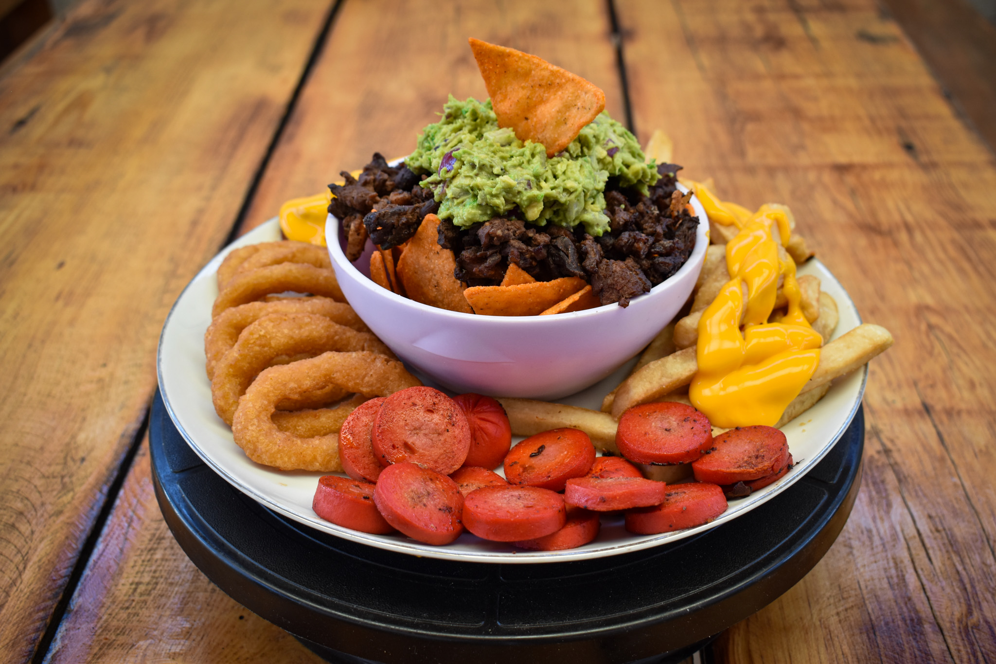 Con 200 g de arrachera, sobre una cama de Doritos, salchicha para asar, guacamole, acompañados de papas gajo, papas a la francesa, aros de cebolla y verdura.