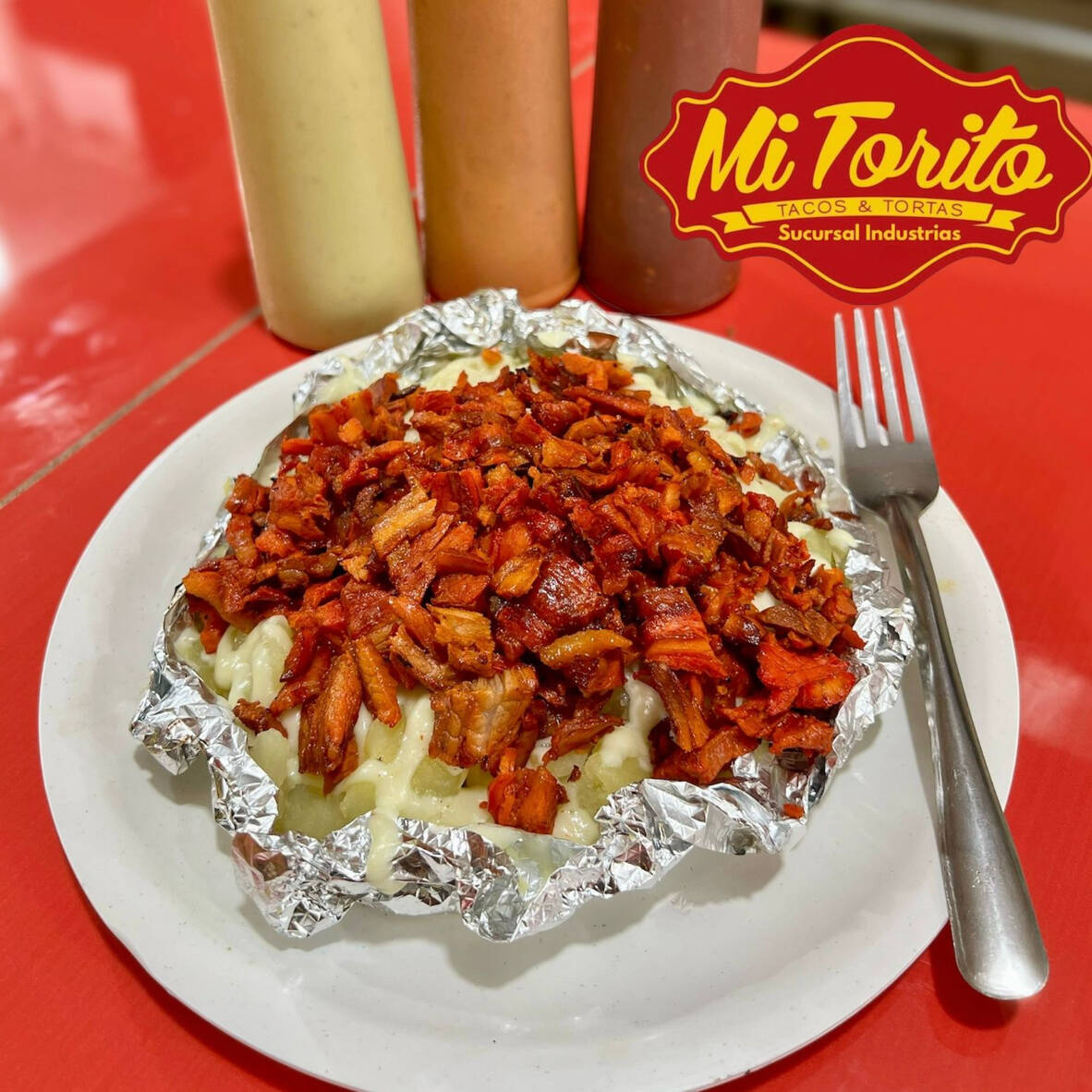 Papa Asada con Pastor, Bistec Top Sirloin y Chorizo y Queso Laurel