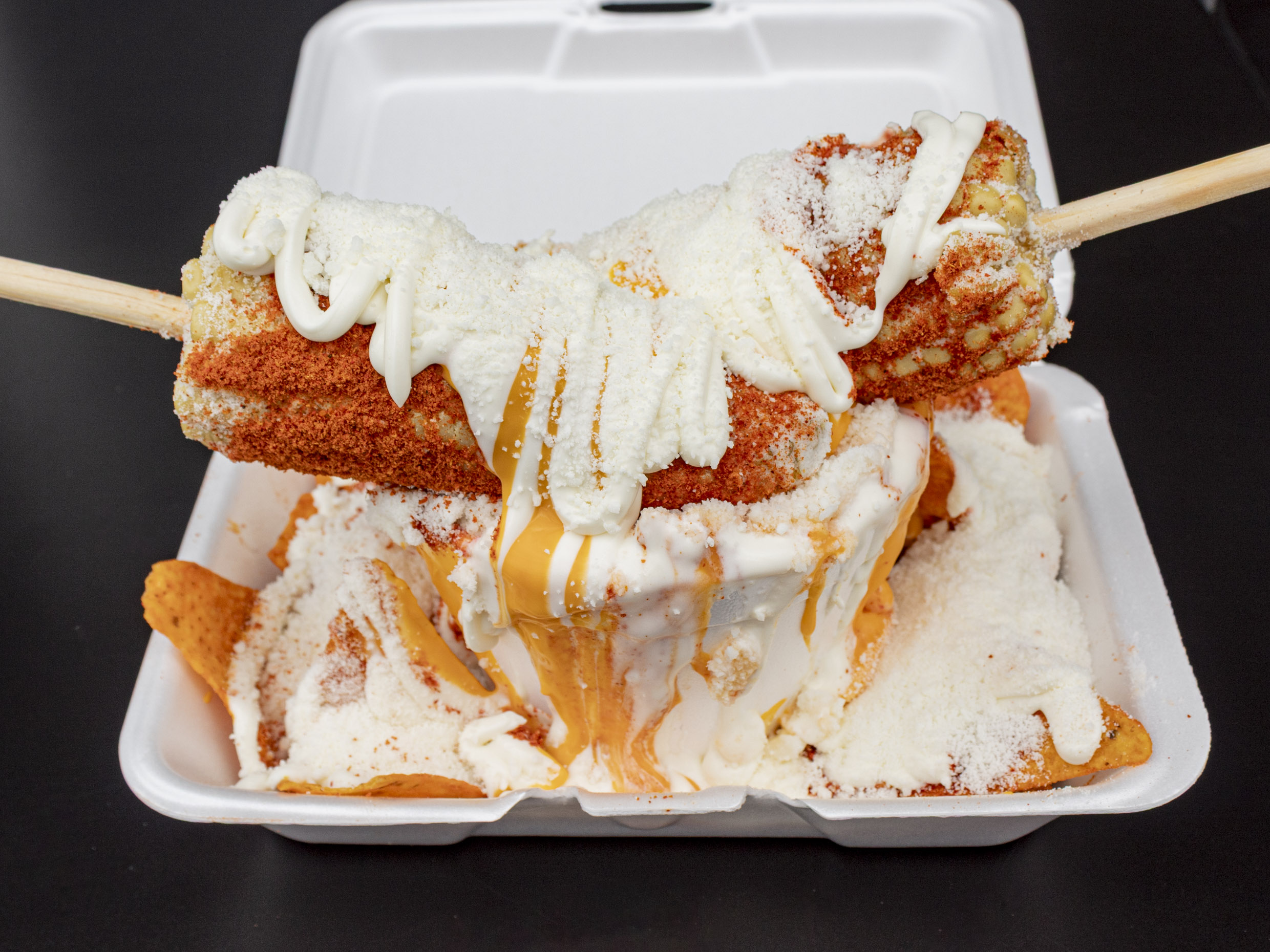 FAVOR DE ELEGIR SUS INGREDIENTES. Elote, crema, mantequilla, chile en polvo, sal, limón, queso blanco