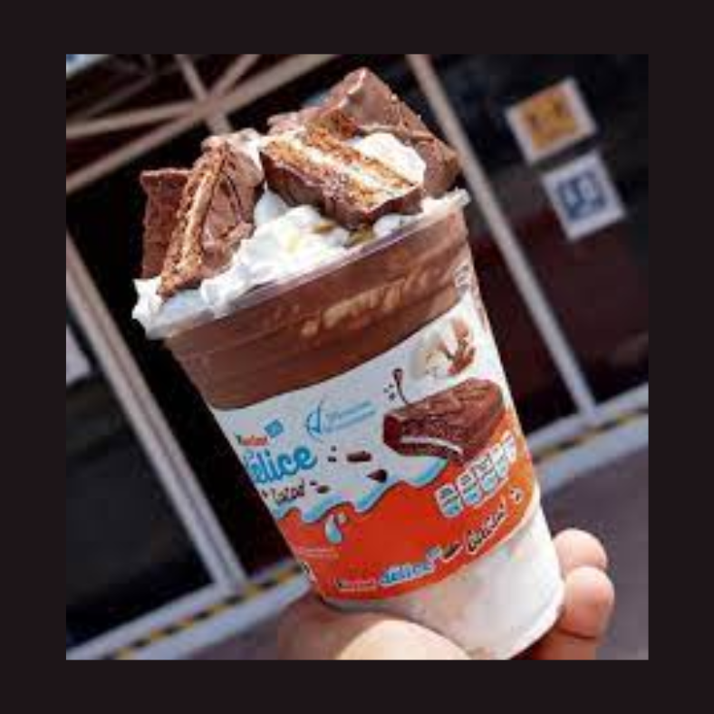 Malteada a base de nieve y kinder, decorado con chantilly y un trozo de kinder