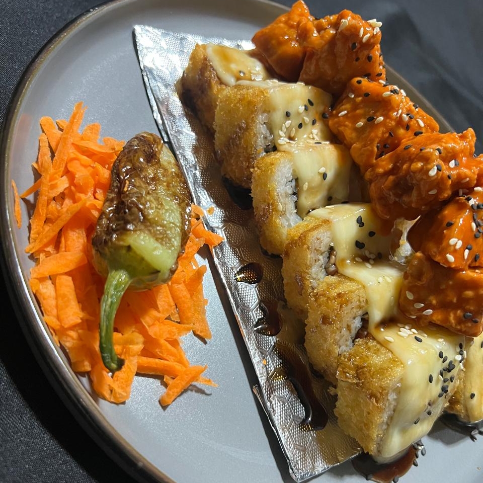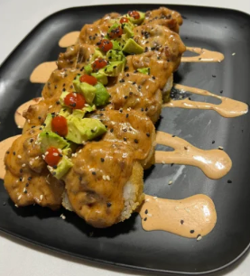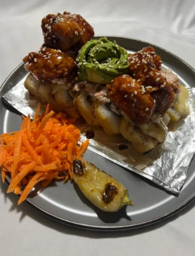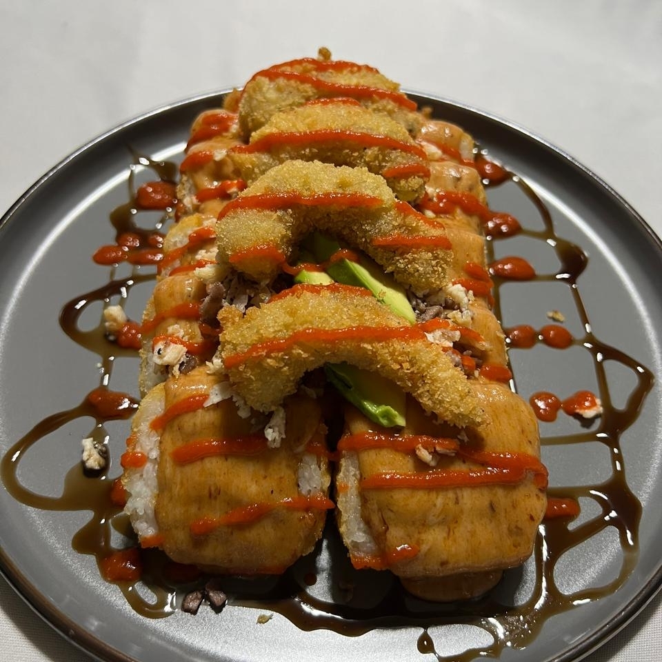 Rollo empanizado relleno de pollo, pepino, aguacate, Philadelphia y res. Por fuera gratinado de queso Chihuahua, escarchado con res y pollo frito. Decorado con aguacate, camarones empanizados, salsa de anguila y siracha.