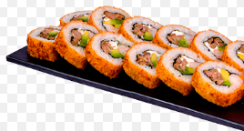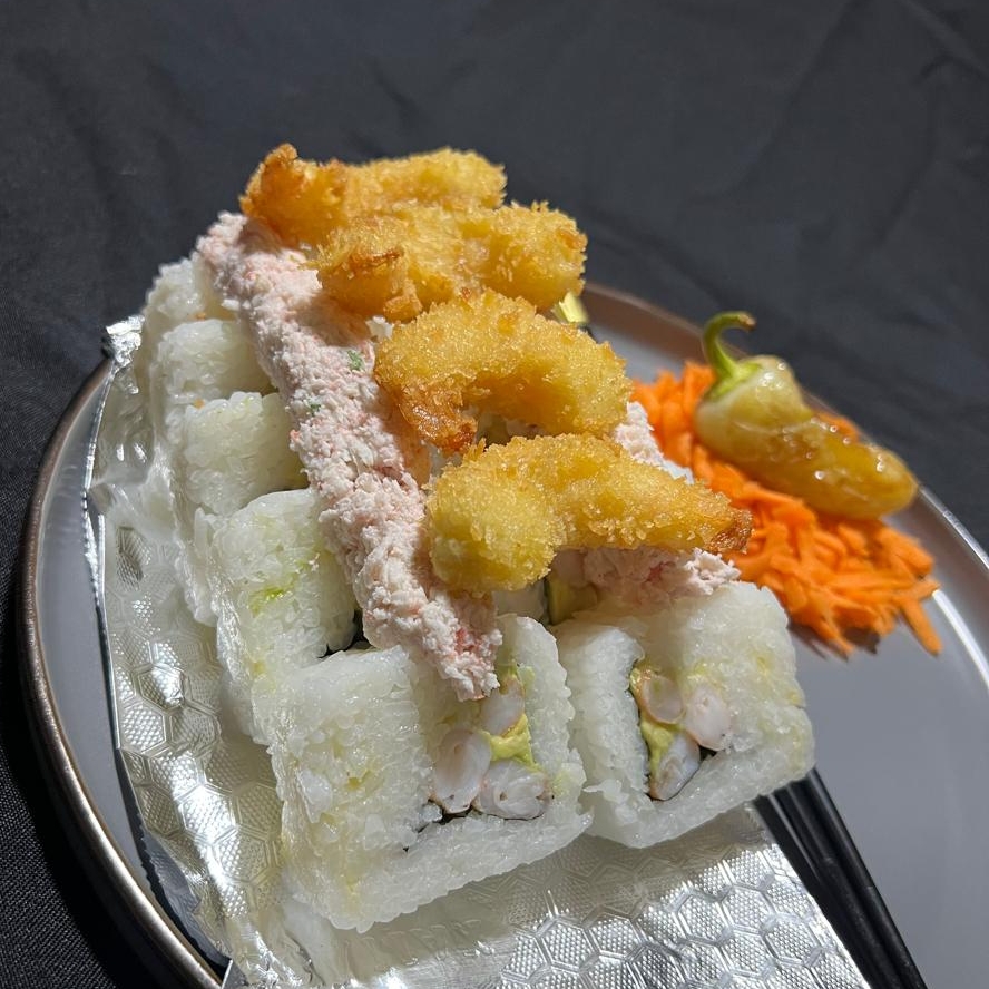 Rollo natural relleno con dos ingredientes a elegir (res, camarón, pollo). Por fuera toppings de Tampico y camarón empanizado.