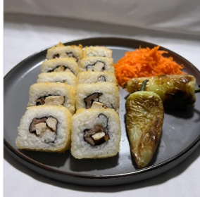 pasta tampico,Philadelphia y aguacate por dentro.por fuera pollo,pepino,zanahoria.