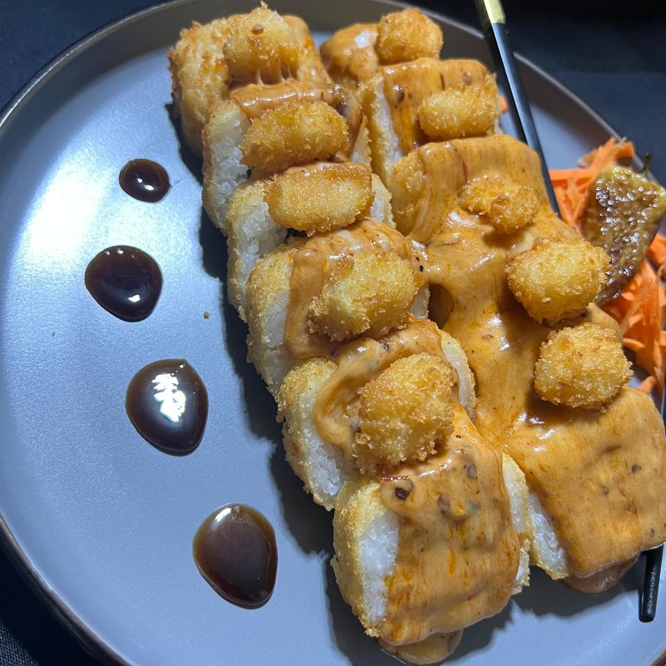 Rollo empanizado relleno de camarón y Philadelphia. Por fuera coronado de Tampico, salsa de anguila y ajonjolí.