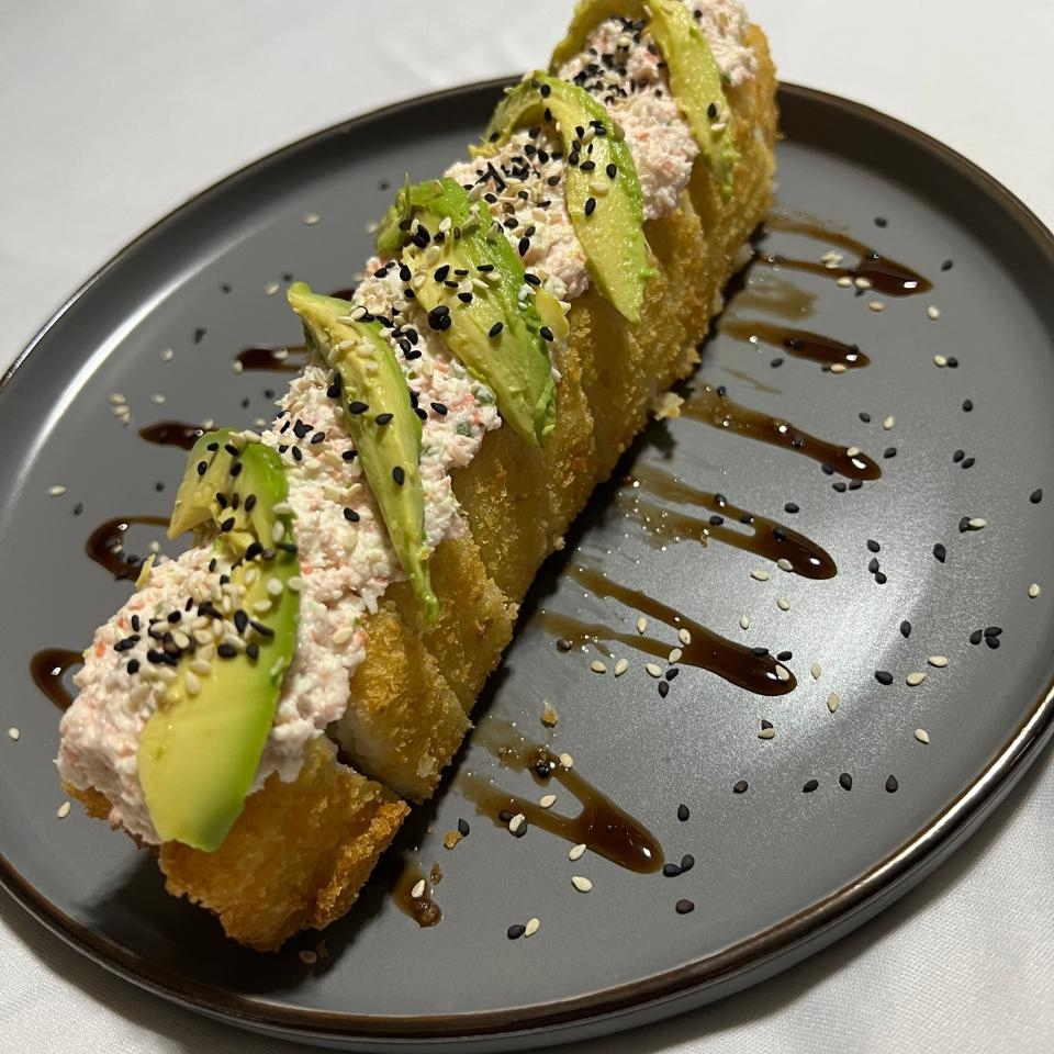 Rollo empanizado relleno de res, pollo y camarón. Por fuera gratinado de queso Chihuahua y pequeñas bolas de queso. Decorado con Tampico, aguacate y salsa de anguila.