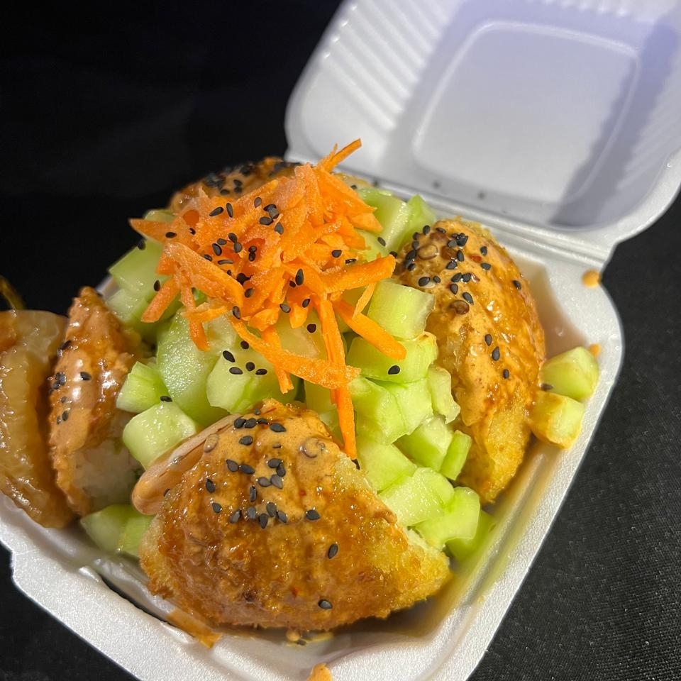 Bola de arroz empanizada, rellena de pasta de Tampico, aguacate, Philadelphia, res y pollo. Con topping de pepino y gratinado spicy.
