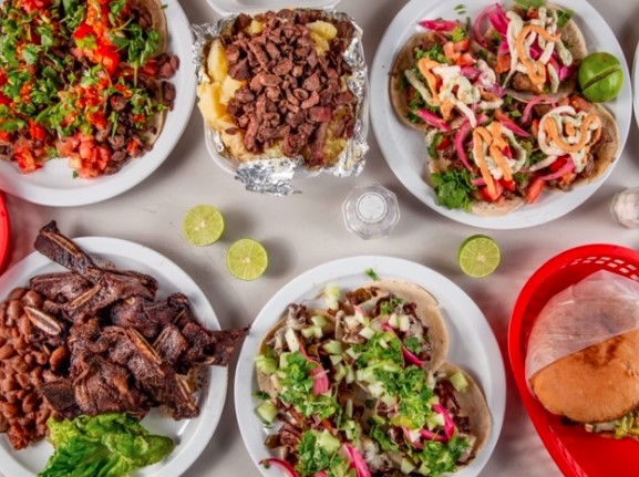Carne asada, tripitas, tortilla de harina, asadero y frijoles. Incluye verdura