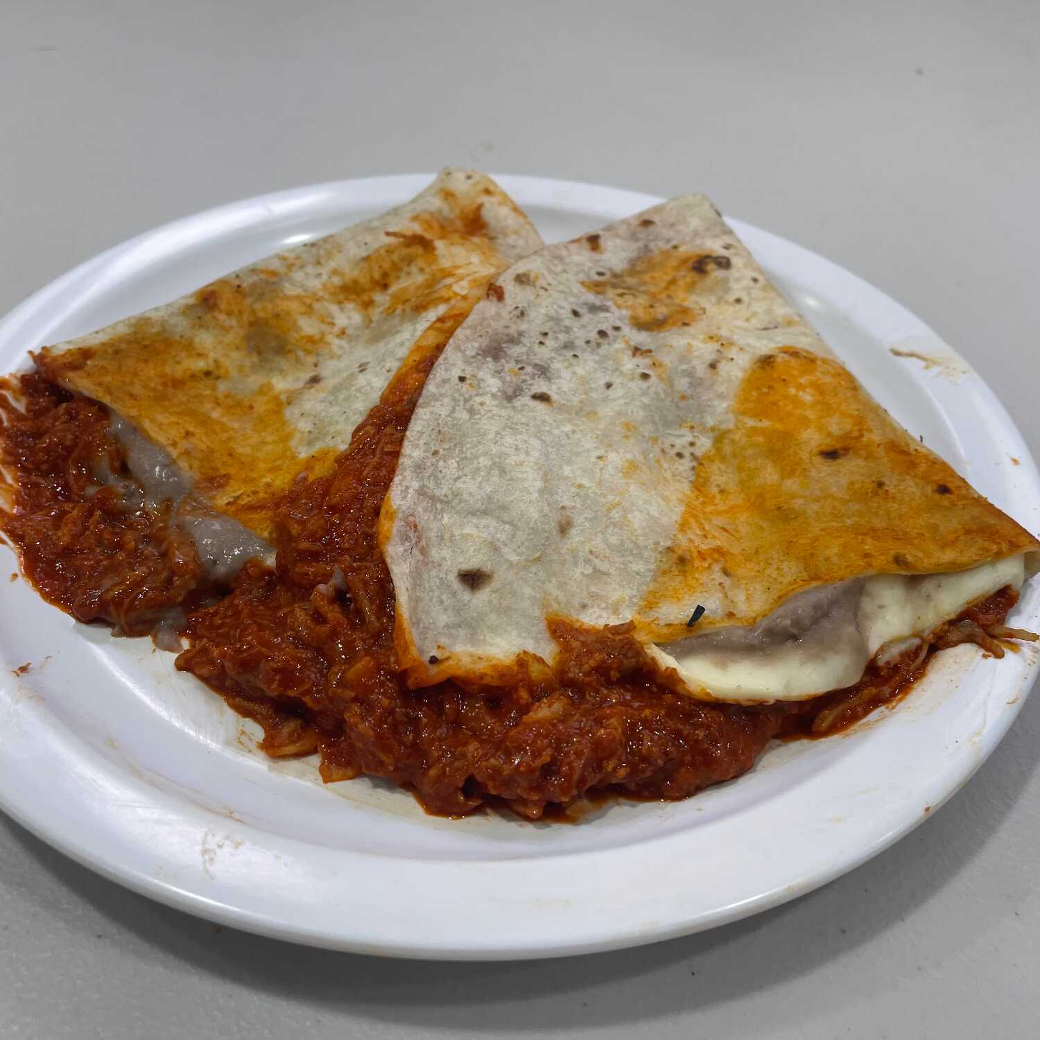 Deshebrada de puerco en salsa roja, tortilla de harina, asadero, frijoles