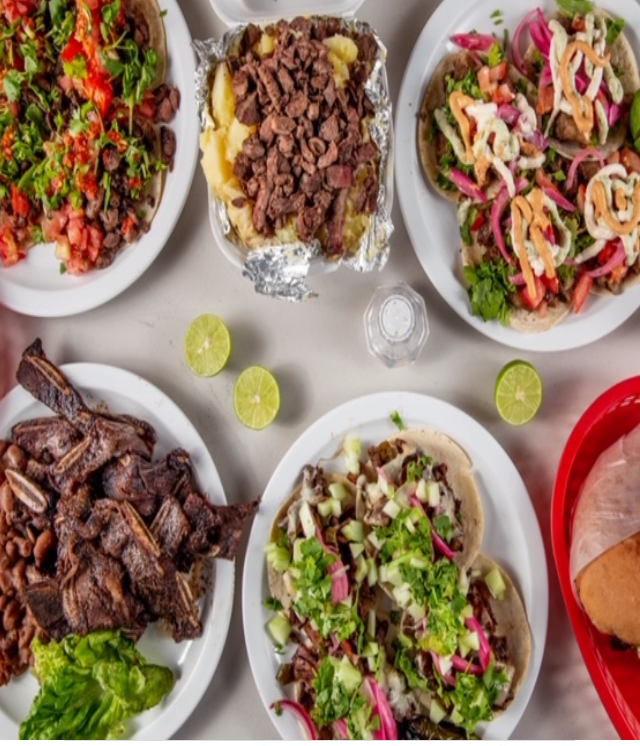 Carne asada, asadero y tortilla de harina o maíz. Incluye plato de verdura (pepino, cilantro, tomate y limones)