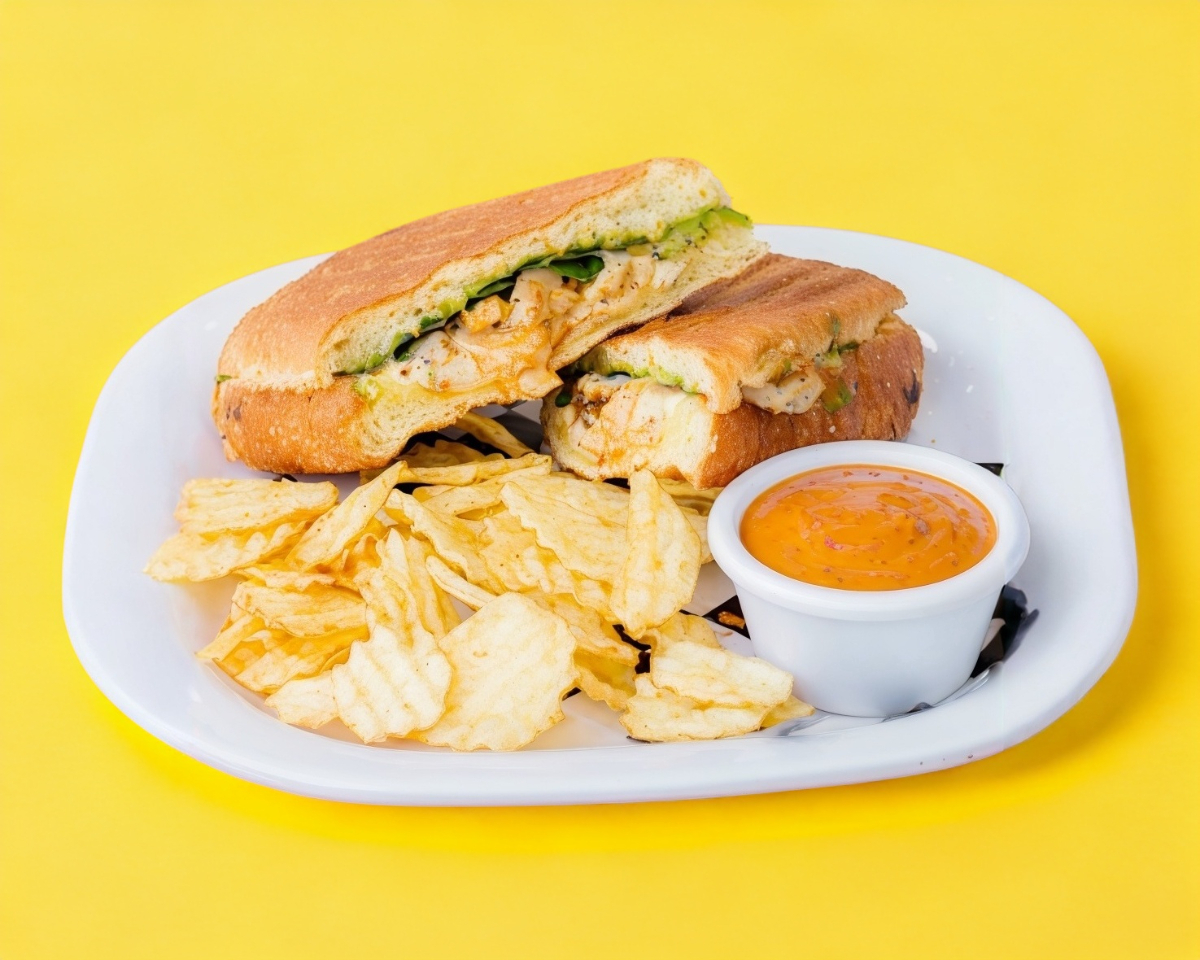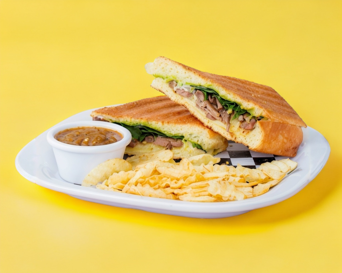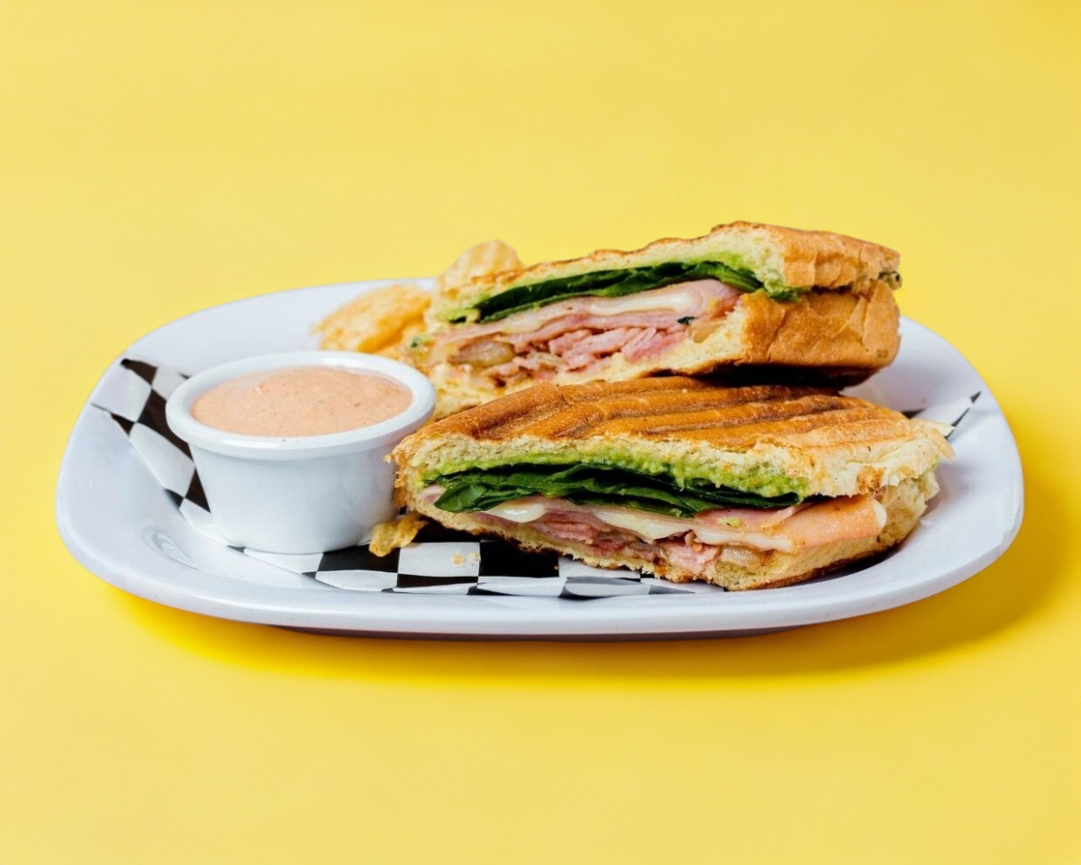 Panini de jamón de pavo, con tocino, aguacate, queso asadero, cebolla caramelizada y espinacas. Incluye papas chips y salsa de la casa a escoger.