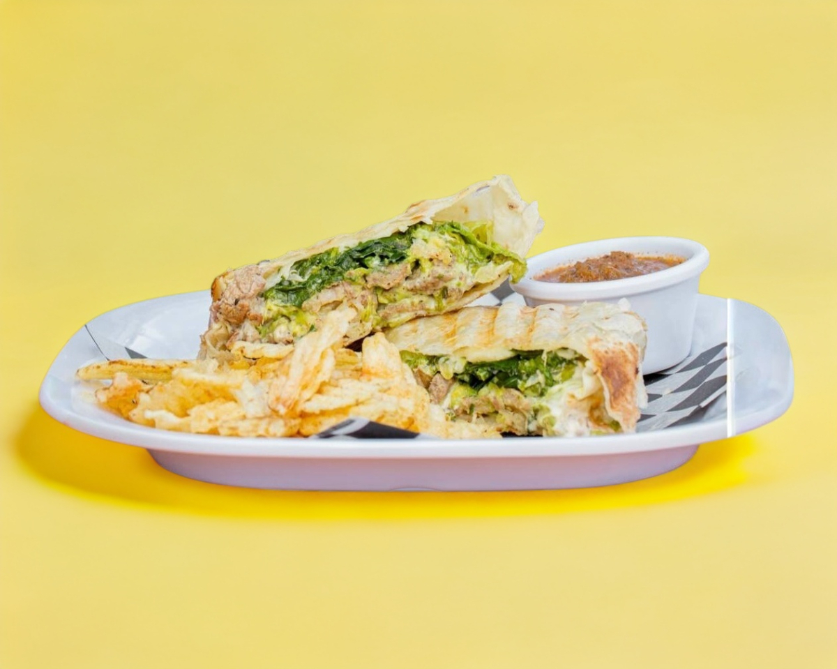 Pollo a la plancha, queso asadero, aguacate, salsa chipotle y espinacas. Incluye papas chips y salsa de la casa a escoger.