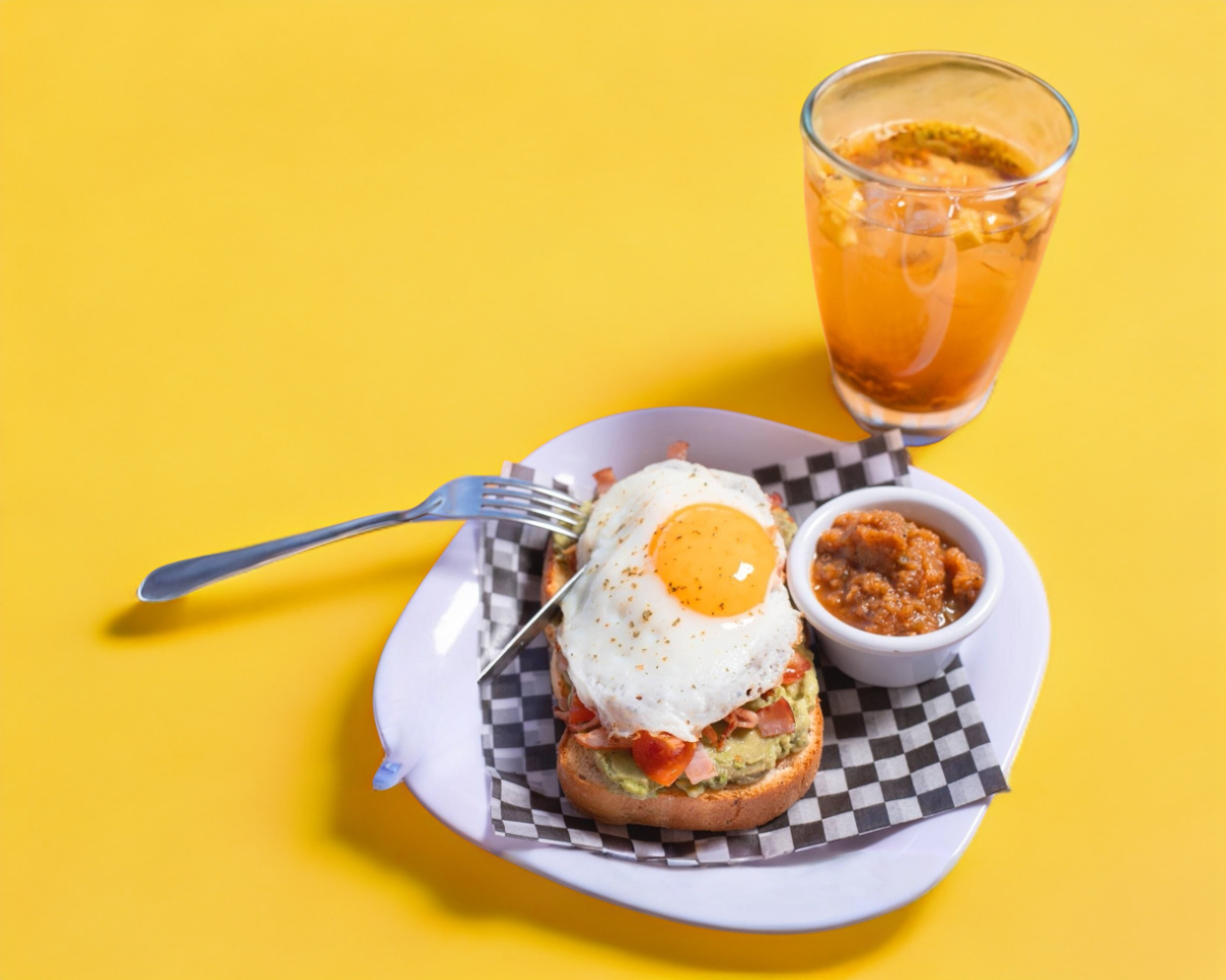 Pan tostado montado con aguacate, tomate cherry, tocino, un huevo estrellado y especias de la casa.