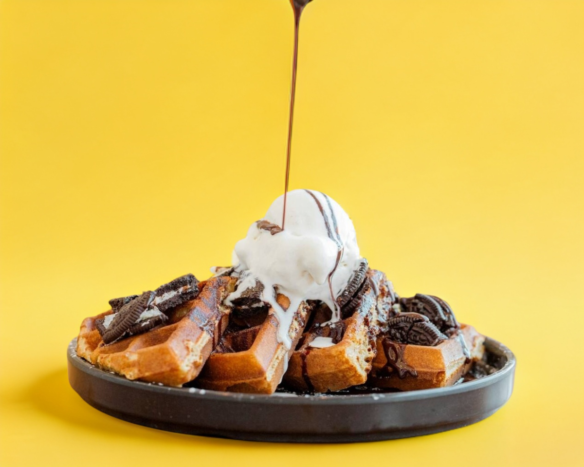 Waffle montado con nieve de vainilla, chocolate Hersheys y galleta Oreo.